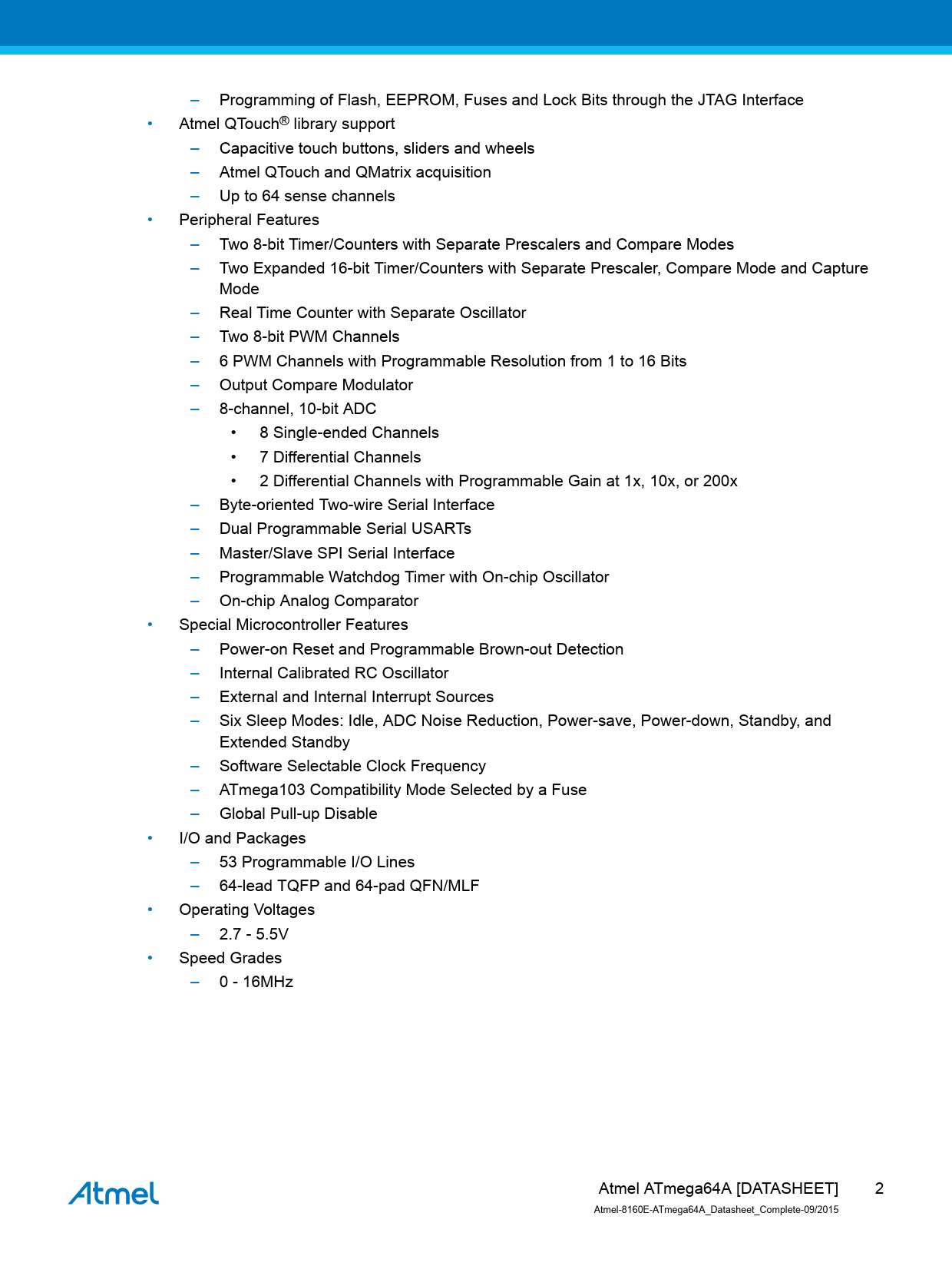 –. Programming. of. Flash,. EEPROM,. Fuses. and. Lock. Bits. through. the. JTAG. Interface. •. Atmel. QTouch®. library. support. –. Capacitive. touch. buttons,