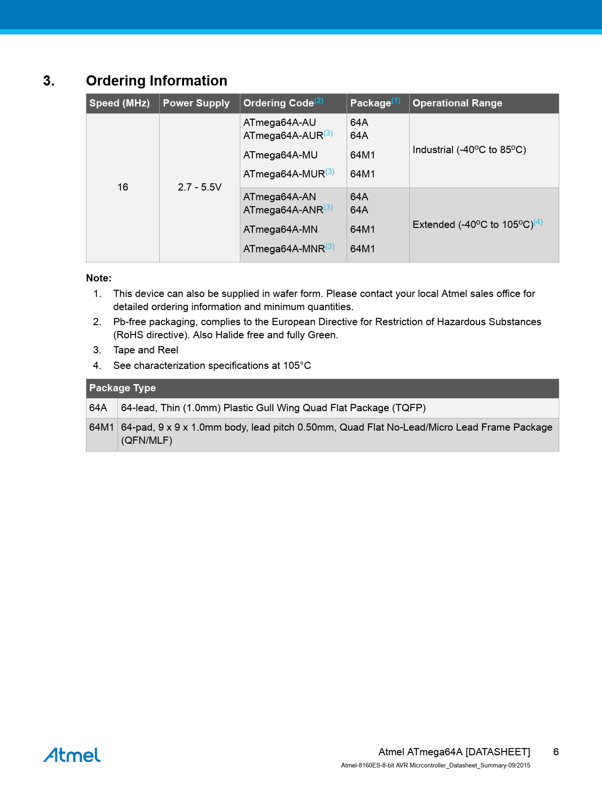 ATmega64A-AU 64A ATmega64A-AUR(3) 64A ATmega64A-MU 64M1 Industrial (-40oC to 85oC) ATmega64A-MUR(3) 64M1 16 2.7 - 5.5V ATmega64A-AN 64A ATmega64A-ANR(3) 64A ATmega64A-MN 64M1 Extended (-40oC to 105oC)(4) ATmega64A-MNR(3) 64M1