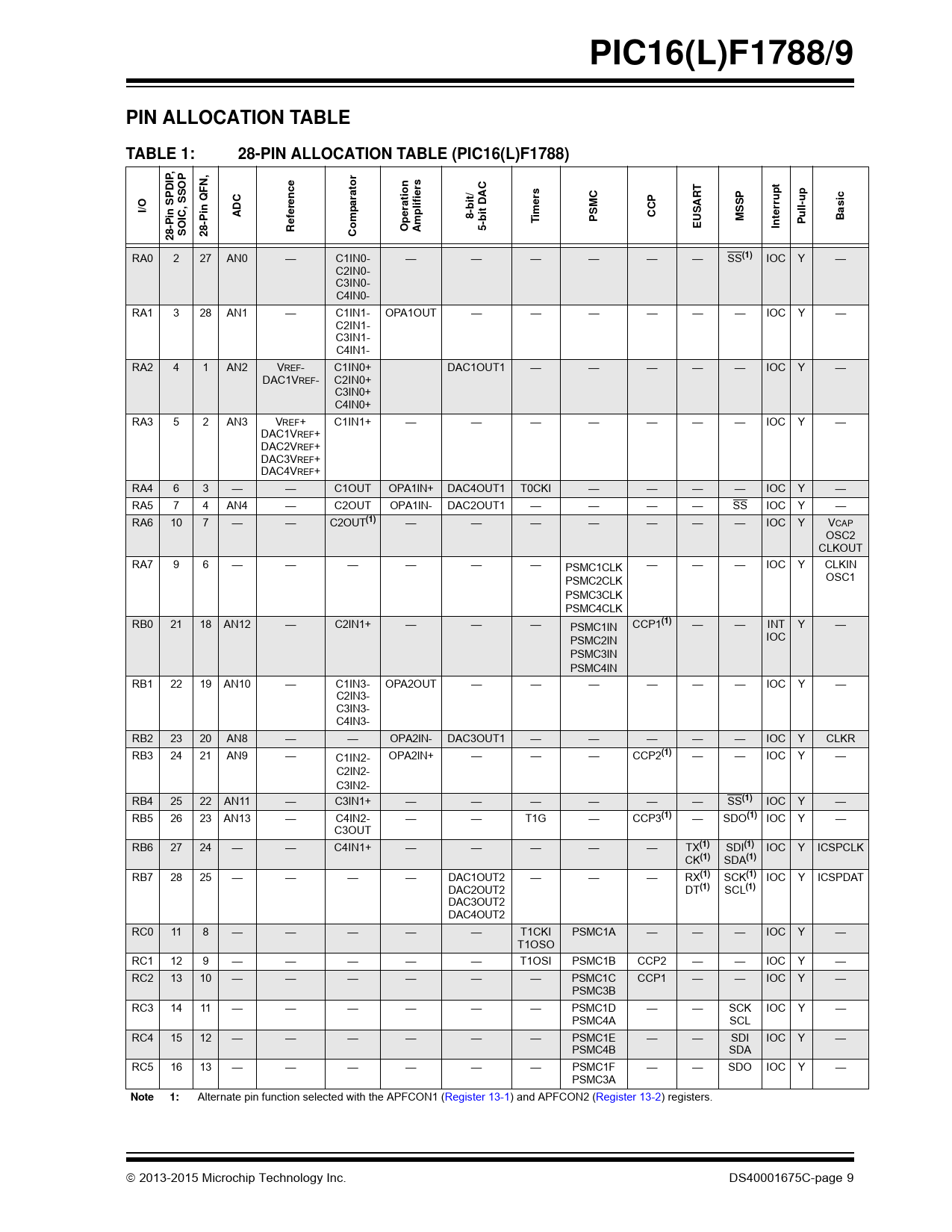 PIC16(L)F1788/9. PIN ALLOCATION TABLE. TABLE 1:. 28-PIN ALLOCATION TABLE (PIC16(L)F1788). , P. c n. ier. I/O. lif. t D. SSP. rru. ll-u. ADC. OIC, S