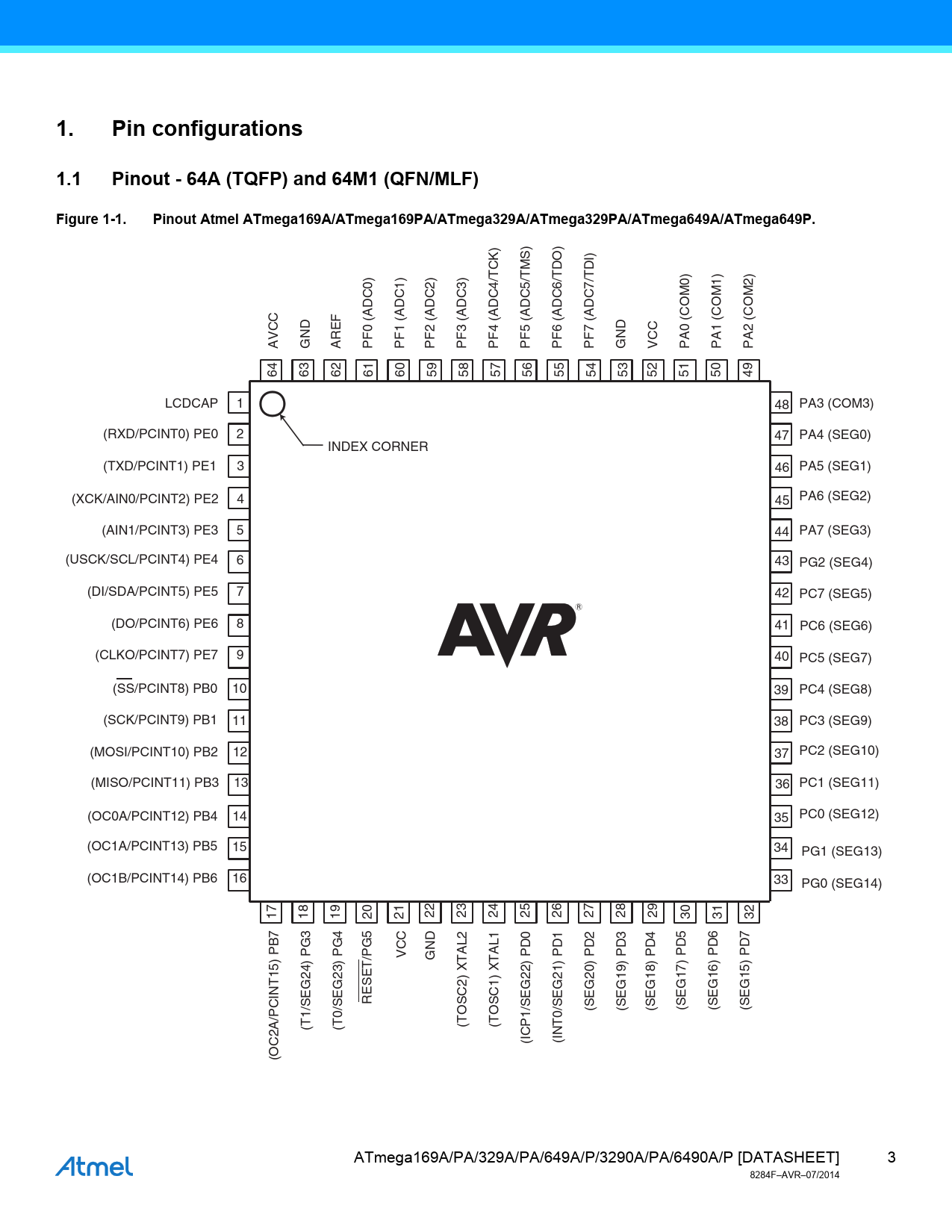 1. Pin configurations 1.1 Pinout - 64A (TQFP) and 64M1 (QFN/MLF) Figure 1-1. Pinout Atmel ATmega169A/ATmega169PA/ATmega329A/ATmega329PA/ATmega649A/ATmega649P.