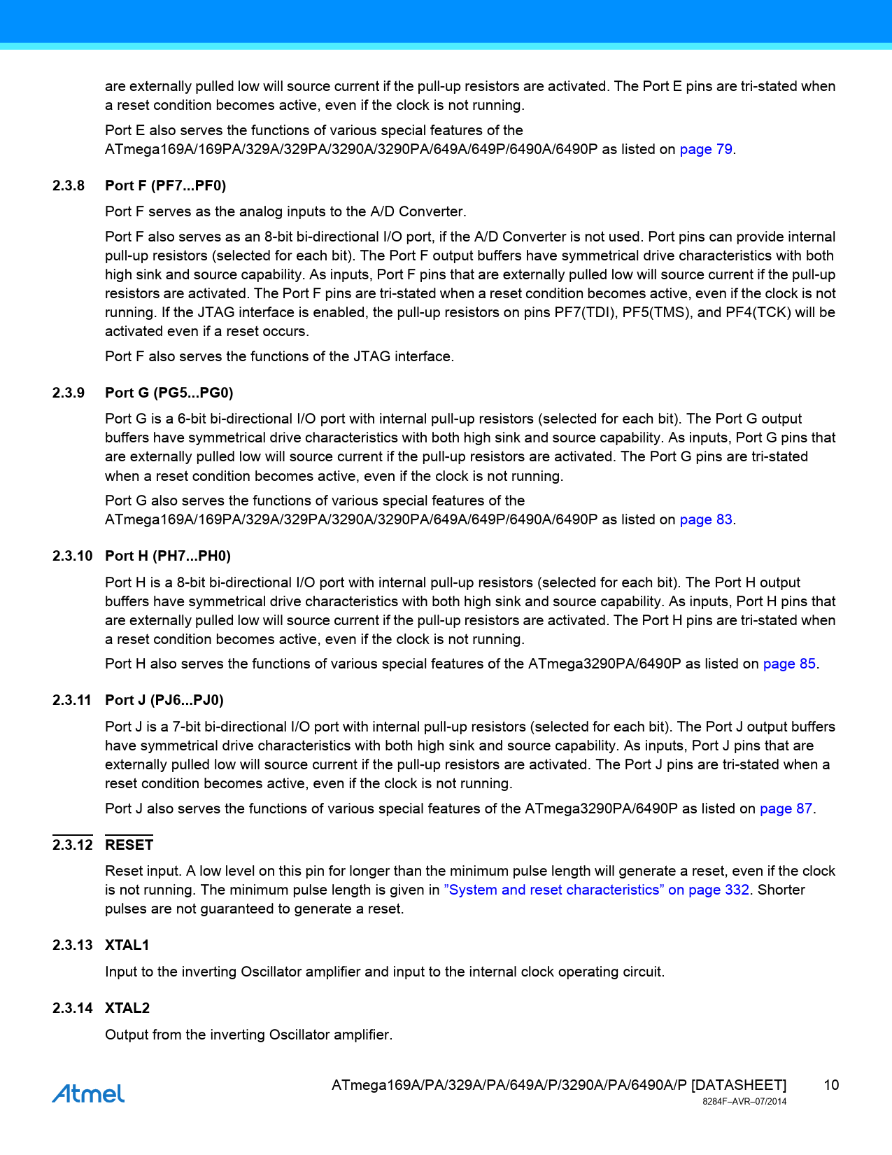 2.3.8. Port F (PF7...PF0). 2.3.9. Port G (PG5...PG0). 2.3.10 Port H (PH7...PH0). 2.3.11 Port J (PJ6...PJ0). 2.3.12 RESET