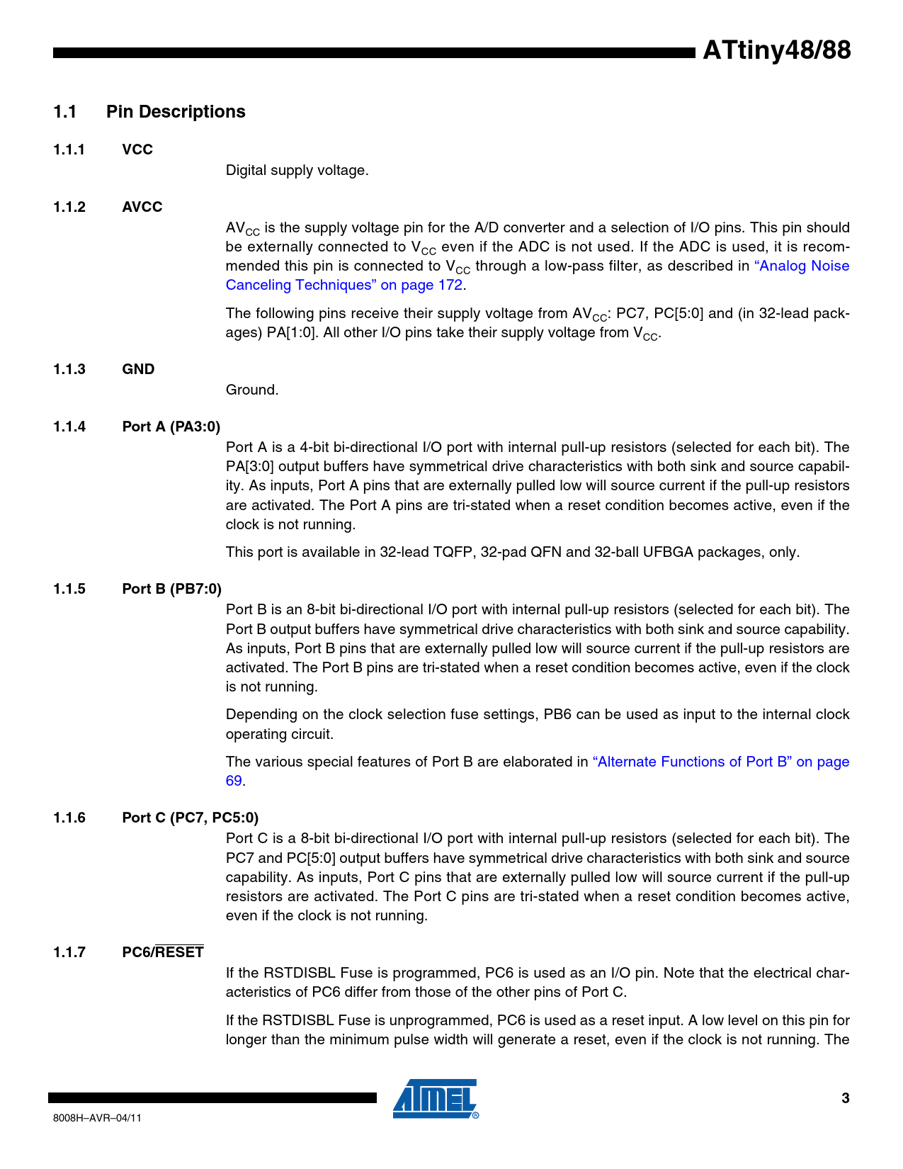 ATtiny48/88. 1.1. Pin Descriptions. 1.1.1. VCC. 1.1.2. AVCC. 1.1.3. GND. 1.1.4. Port A (PA3:0). 1.1.5. Port B (PB7:0). 1.1.6. Port C (PC7, PC5:0)