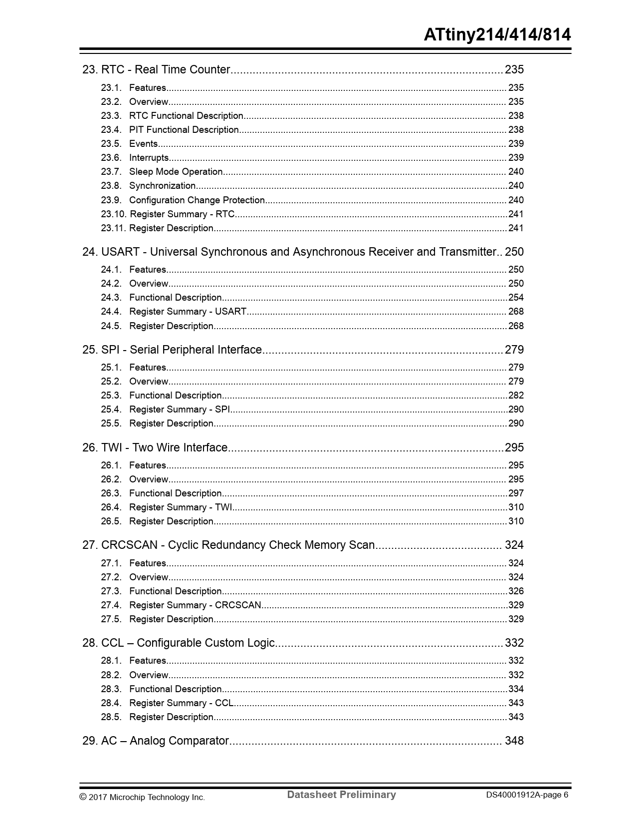 23. RTC - Real Time Counter.. 235 23.1. Features... 235 23.2. Overview.. 235 23.3. RTC Functional Description... 238 23.4. PIT Functional Description... 238 23.5. Events.. 239 23.6. Interrupts.. 239 23.7. Sleep Mode Operation... 240 23.8. Synchronization..240 23.9. Configuration Change Protection... 240 23.10. Register Summary - RTC...241 23.11. Register Description... 241 24. USART - Universal Synchronous and Asynchronous Receiver and Transmitter.. 250 24.1. Features... 250 24.2. Overview.. 250 24.3. Functional Description..254 24.4. Register Summary - USART.. 268 24.5. Register Description... 268 25. SPI - Serial Peripheral Interface.. 279 25.1. Features... 279 25.2. Overview.. 279 25.3. Functional Description..282 25.4. Register Summary - SPI...290 25.5. Register Description... 290 26. TWI - Two Wire Interface...295 26.1. Features... 295 26.2. Overview.. 295 26.3. Functional Description..297 26.4. Register Summary - TWI..310 26.5. Register Description... 310 27. CRCSCAN - Cyclic Redundancy Check Memory Scan.. 324 27.1. Features... 324 27.2. Overview.. 324 27.3. Functional Description..326 27.4. Register Summary - CRCSCAN...329 27.5. Register Description... 329 28. CCL – Configurable Custom Logic.. 332 28.1. Features... 332 28.2. Overview.. 332 28.3. Functional Description..334 28.4. Register Summary - CCL... 343 28.5. Register Description... 343 29. AC – Analog Comparator.. 348 © 2017 Microchip Technology Inc.