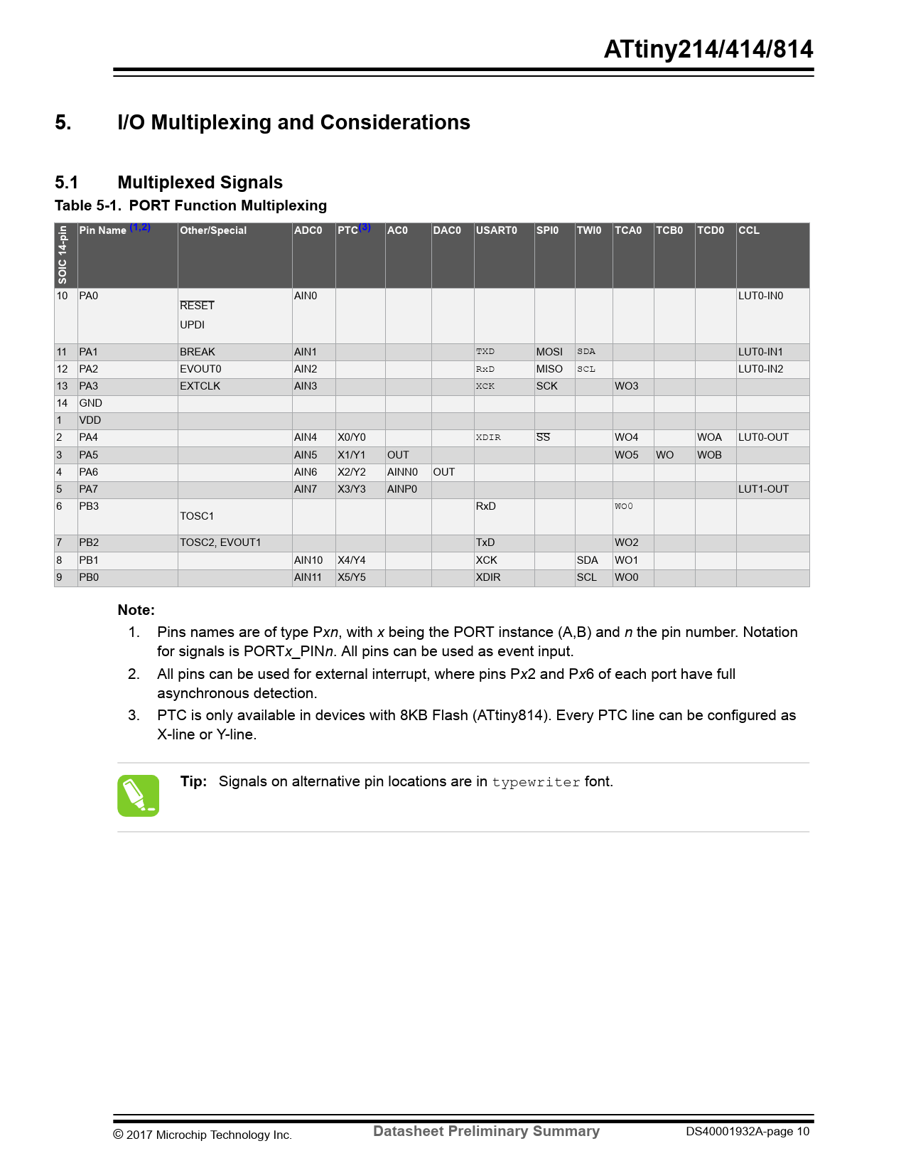 ATtiny214/414/814. I/O Multiplexing and Considerations. 5.1. Multiplexed Signals. Table 5-1. PORT Function Multiplexing