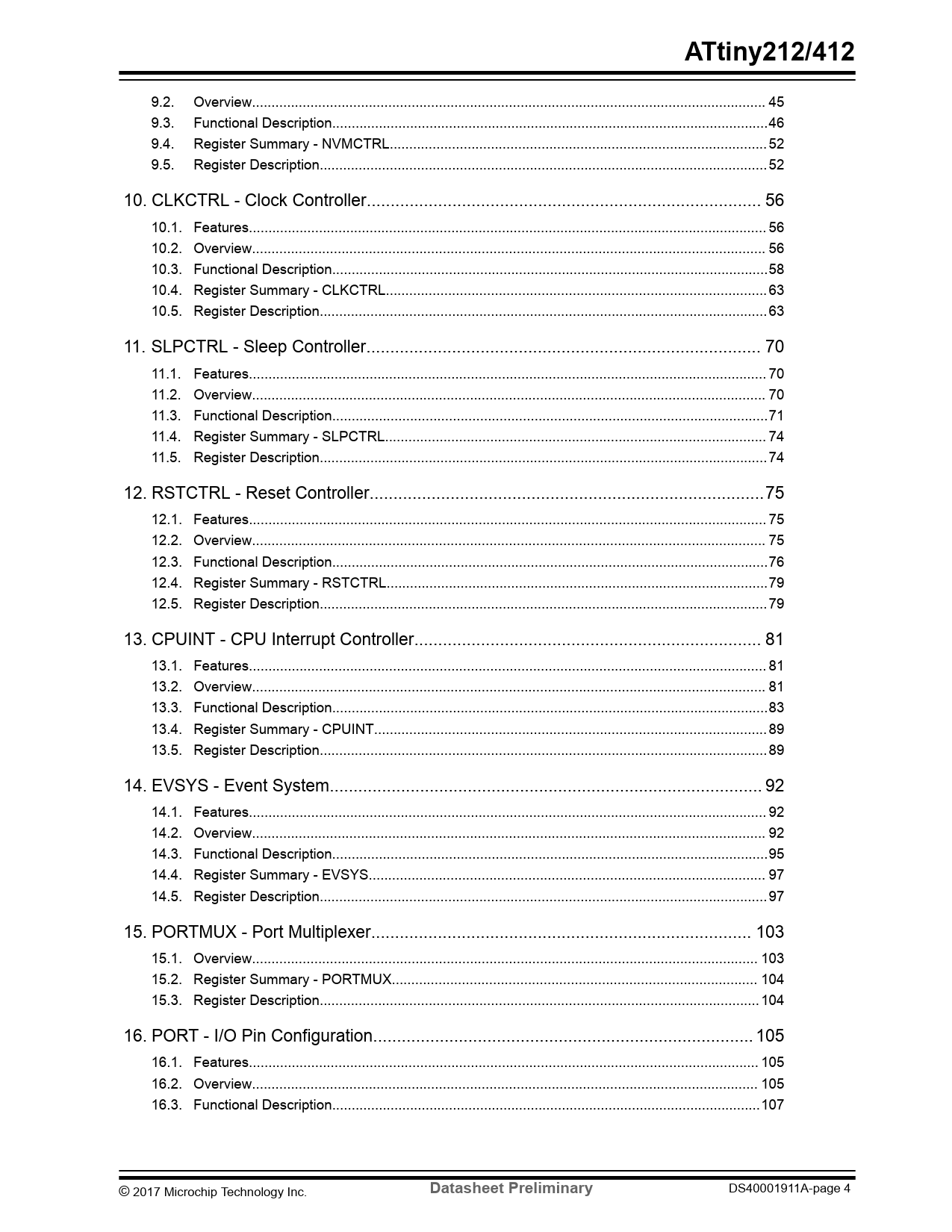 9.2. Overview.. 45 9.3. Functional Description..46 9.4. Register Summary - NVMCTRL... 52 9.5. Register Description... 52 10. CLKCTRL - Clock Controller... 56 10.1. Features... 56 10.2. Overview.. 56 10.3. Functional Description..58 10.4. Register Summary - CLKCTRL.. 63 10.5. Register Description... 63 11. SLPCTRL - Sleep Controller... 70 11.1. Features... 70 11.2. Overview.. 70 11.3. Functional Description..71 11.4. Register Summary - SLPCTRL.. 74 11.5. Register Description... 74 12. RSTCTRL - Reset Controller...75 12.1. Features... 75 12.2. Overview.. 75 12.3. Functional Description..76 12.4. Register Summary - RSTCTRL..79 12.5. Register Description... 79 13. CPUINT - CPU Interrupt Controller... 81 13.1. Features... 81 13.2. Overview.. 81 13.3. Functional Description..83 13.4. Register Summary - CPUINT... 89 13.5. Register Description... 89 14. EVSYS - Event System... 92 14.1. Features... 92 14.2. Overview.. 92 14.3. Functional Description..95 14.4. Register Summary - EVSYS.. 97 14.5. Register Description... 97 15. PORTMUX - Port Multiplexer.. 103 15.1. Overview.. 103 15.2. Register Summary - PORTMUX.. 104 15.3. Register Description... 104 16. PORT - I/O Pin Configuration.. 105 16.1. Features... 105 16.2. Overview.. 105 16.3. Functional Description..107 © 2017 Microchip Technology Inc.