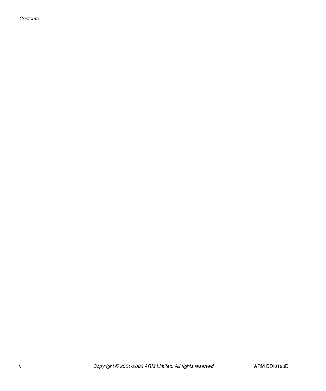 Contents. vi. Copyright. ©. 2001-2003. ARM. Limited. All. rights. reserved. ARM. DDI0198D. Document. Outline. Contents. List. of. Tables. List. of. Figures