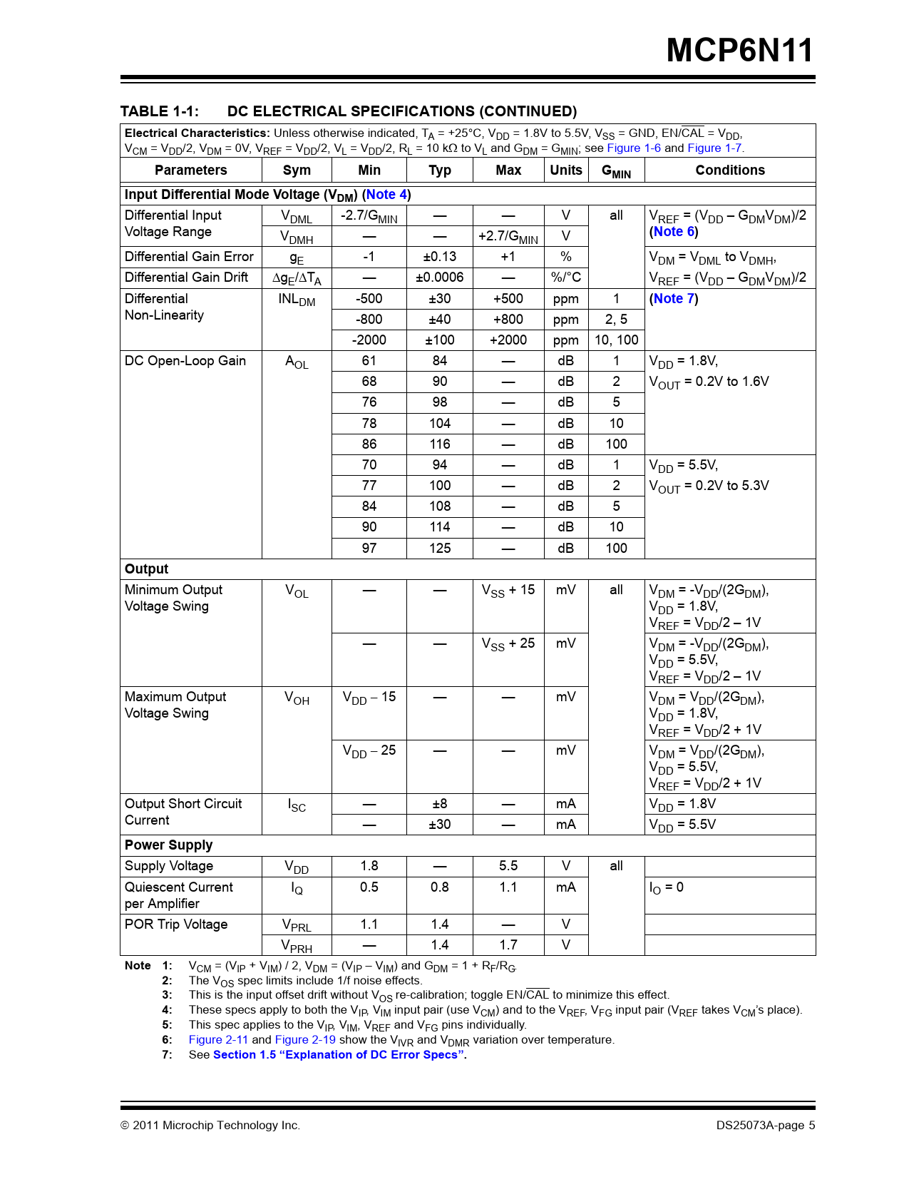 MCP6N11 TABLE 1-1: DC ELECTRICAL SPECIFICATIONS (CONTINUED) Electrical Characteristics: