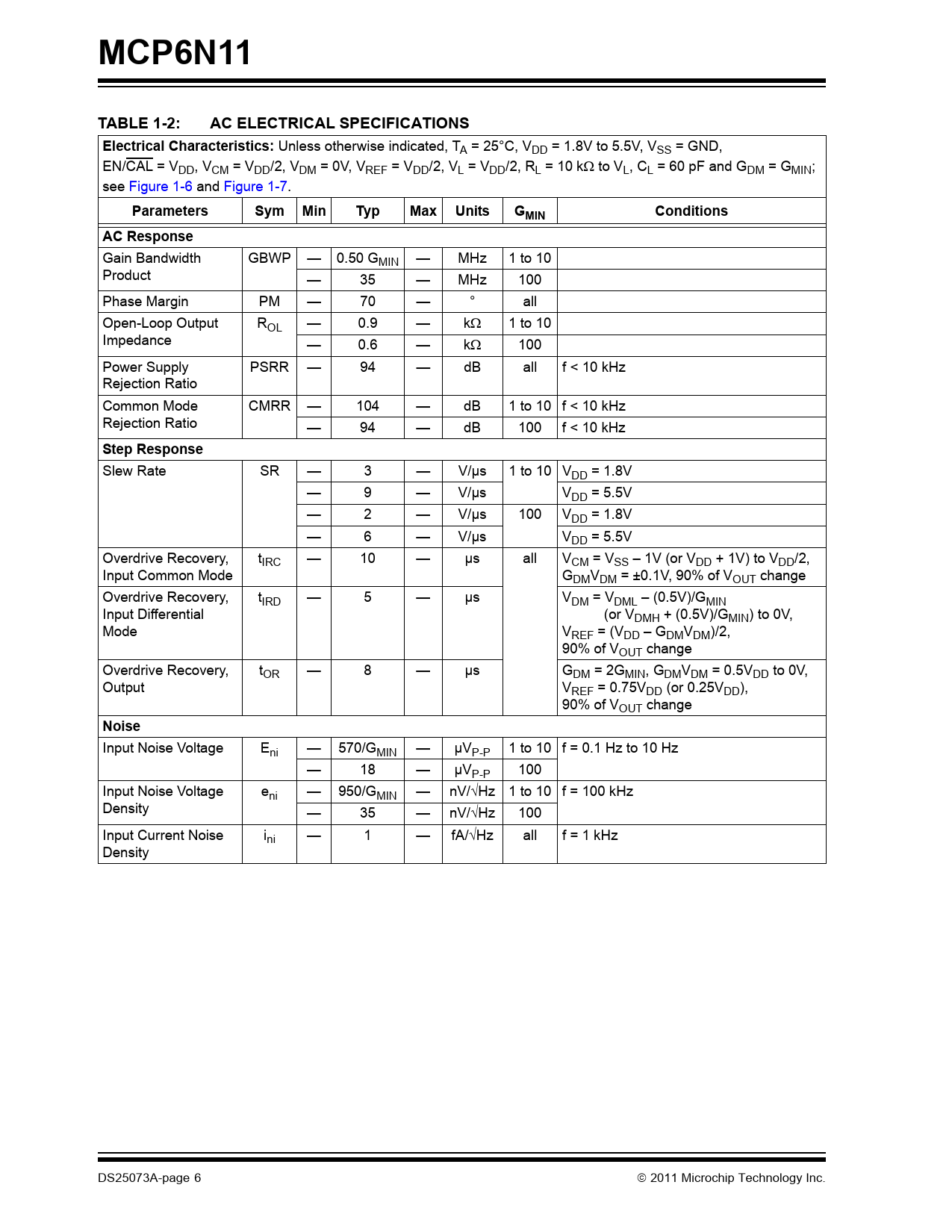 MCP6N11 TABLE 1-2: AC ELECTRICAL SPECIFICATIONS Electrical Characteristics: