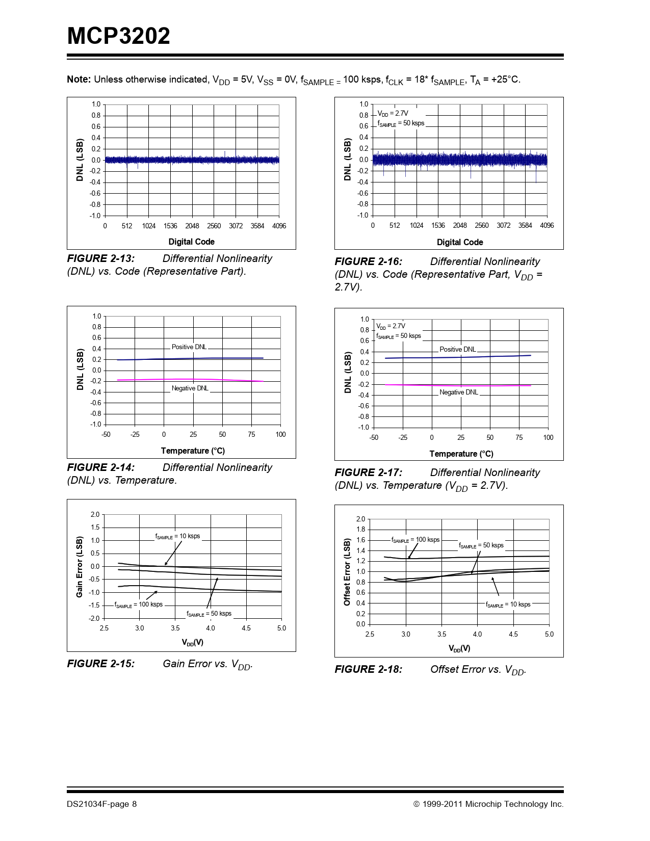 MCP3202Note: Unless otherwise indicated, VDD = 5V, VSS = 0V, fSAMPLE = 100 ksps, fCLK = 18* fSAMPLE, TA = +25°C. 1.0 1.0 0.8 0.8 VDD = 2.7V 0.6 0.6 fSAMPLE = 50 ksps ) 0.4 ) 0.4 BB 0.2 SS 0.2 LL( 0.0 ( 0.0 -0.2 -0.2 DNLDNL -0.4 -0.4 -0.6 -0.6 -0.8 -0.8 -1.0 -1.0 0 512 1024 1536 2048 2560 3072 3584 4096 0 512 1024 1536 2048 2560 3072 3584 4096 Digital CodeDigital CodeFIGURE 2-13: Differential Nonlinearity FIGURE 2-16: Differential Nonlinearity (DNL) vs. Code (Representative Part). (DNL) vs. Code (Representative Part, VDD = 2.7V). 1.0 1.0 0.8 V 0.8 DD = 2.7V 0.6 f 0.6 SAMPLE = 50 ksps ) 0.4 Positive DNL Positive DNL B) 0.4 S 0.2 BLS 0.2 0.0 L 0.0 -0.2 DNL ( -0.2 Negative DNL -0.4 DNL ( -0.4 Negative DNL -0.6 -0.6 -0.8 -0.8 -1.0 -1.0 -50 -25 0 25 50 75 100 -50 -25 0 25 50 75 100 Temperature (°C)Temperature (°C)FIGURE 2-14: Differential Nonlinearity FIGURE 2-17: Differential Nonlinearity (DNL) vs. Temperature. (DNL) vs. Temperature (VDD = 2.7V). 2.0 2.0 1.5 1.8 ) f 1.0 B SAMPLE = 10 ksps ) 1.6 fSAMPLE = 100 ksps SB S fSAMPLE = 50 ksps 0.5 (L 1.4 L r ( 1.2 0.0 rror 1.0 rro -0.5 in E 0.8 -1.0 Ga 0.6 fset E -1.5 f Of 0.4 SAMPLE = 100 ksps fSAMPLE = 10 ksps f 0.2 -2.0 SAMPLE = 50 ksps 0.0 2.5 3.0 3.5 4.0 4.5 5.0 2.5 3.0 3.5 4.0 4.5 5.0 VDD(V)VDD(V)FIGURE 2-15: Gain Error vs. VDD. FIGURE 2-18: Offset Error vs. VDD. DS21034F-page 8 1999-2011 Microchip Technology Inc. Document Outline MCP3202 - 2.7V Dual Channel 12-Bit A/D Converter with SPI Serial Interface Functional Block Diagram Package Types 1.0 Electrical Characteristics Absolute Maximum Ratings † FIGURE 1-1: Serial Timing. FIGURE 1-2: Test Circuits. 2.0 Typical Performance Characteristics FIGURE 2-1: Integral Nonlinearity (INL) vs. Sample Rate. FIGURE 2-2: Integral Nonlinearity (INL) vs. VDD. FIGURE 2-3: Integral Nonlinearity (INL) vs. Code (Representative Part). FIGURE 2-4: Integral Nonlinearity (INL) vs. Sample Rate (VDD = 2.7V). FIGURE 2-5: Integral Nonlinearity (INL) vs. VDD. FIGURE 2-6: Integral Nonlinearity (INL) vs. Code (Representative Part, VDD = 2.7V). FIGURE 2-7: Integral Nonlinearity (INL) vs. Temperature. FIGURE 2-8: Differential Nonlinearity (DNL) vs. Sample Rate. FIGURE 2-9: Differential Nonlinearity (DNL) vs. VDD. FIGURE 2-10: Integral Nonlinearity (INL) vs. Temperature (VDD = 2.7V). FIGURE 2-11: Differential Nonlinearity (DNL) vs. Sample Rate (VDD = 2.7V). FIGURE 2-12: Differential Nonlinearity (DNL) vs. VDD. FIGURE 2-13: Differential Nonlinearity (DNL) vs. Code (Representative Part). FIGURE 2-14: Differential Nonlinearity (DNL) vs. Temperature. FIGURE 2-15: Gain Error vs. VDD. FIGURE 2-16: Differential Nonlinearity (DNL) vs. Code (Representative Part, VDD = 2.7V). FIGURE 2-17: Differential Nonlinearity (DNL) vs. Temperature (VDD = 2.7V). FIGURE 2-18: Offset Error vs. VDD. FIGURE 2-19: Gain Error vs. Temperature. FIGURE 2-20: Signal-to-Noise Ratio (SNR) vs. Input Frequency. FIGURE 2-21: Total Harmonic Distortion (THD) vs. Input Frequency. FIGURE 2-22: Offset Error vs. Temperature. FIGURE 2-23: Signal-to-Noise and Distortion (SINAD) vs. Input Frequency. FIGURE 2-24: Signal-to-Noise and Distortion (SINAD) vs. Signal Level. FIGURE 2-25: Effective Number of Bits (ENOB) vs. VDD. FIGURE 2-26: Spurious Free Dynamic Range (SFDR) vs. Input Frequency. FIGURE 2-27: Frequency Spectrum of 10 kHz input (Representative Part). FIGURE 2-28: Effective Number of Bits (ENOB) vs. Input Frequency. FIGURE 2-29: Power Supply Rejection (PSR) vs. Ripple Frequency. FIGURE 2-30: Frequency Spectrum of 1 kHz input (Representative Part, VDD = 2.7V). FIGURE 2-31: IDD vs. VDD. FIGURE 2-32: IDD vs. Clock Frequency. FIGURE 2-33: IDD vs. Temperature. FIGURE 2-34: IDDS vs. VDD. FIGURE 2-35: IDDS vs. Temperature. FIGURE 2-36: Analog Input leakage current vs. Temperature. 3.0 Pin Descriptions TABLE 3-1: Pin Function Table 3.1 Analog Inputs (CH0/CH1) 3.2 Chip Select/Shutdown (CS/SHDN) 3.3 Serial Clock (CLK) 3.4 Serial Data Input (DIN) 3.5 Serial Data Output (DOUT) 4.0 Device Operation 4.1 Analog Inputs 4.2 Digital Output Code EQUATION 4-1: FIGURE 4-1: Analog Input Model. FIGURE 4-2: Maximum Clock Frequency vs. Input Resistance (RS) to maintain less than a 0.1 LSB deviation in INL from nominal conditions. 5.0 Serial Communications 5.1 Overview TABLE 5-1: Configuration Bits for the MCP3202 FIGURE 5-1: Communication with the MCP3202 using MSB first format only. FIGURE 5-2: Communication with MCP3202 using LSB first format. 6.0 Applications Information 6.1 Using the MCP3202 with Microcontroller (MCU) SPI Ports FIGURE 6-1: SPI Communication using 8-bit segments (Mode 0,0: SCLK idles low). FIGURE 6-2: SPI Communication using 8-bit segments (Mode 1,1: SCLK idles high). 6.2 Maintaining Minimum Clock Speed 6.3 Buffering/Filtering the Analog Inputs FIGURE 6-3: The MCP601 Operational Amplifier is used to implement a 2nd order anti- aliasing filter for the signal being converted by the MCP3202. 6.4 Layout Considerations FIGURE 6-4: VDD traces arranged in a ‘Star’ configuration in order to reduce errors caused by current return paths. 7.0 Packaging Information 7.1 Package Marking Information Appendix A: Revision History Worldwide Sales and Service