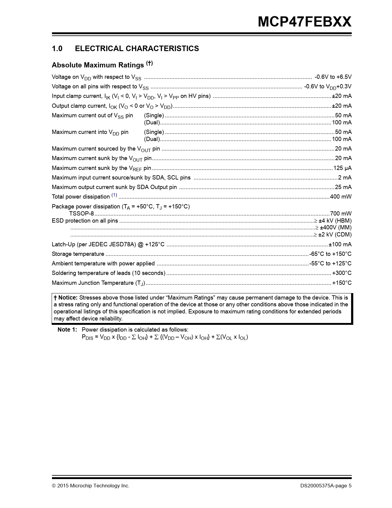 link to page 5 MCP47FEBXX1.0ELECTRICAL CHARACTERISTICSAbsolute Maximum Ratings (†) Voltage on VDD with respect to VSS ... -0.6V to +6.5V Voltage on all pins with respect to VSS ... -0.6V to VDD+0.3V Input clamp current, IIK (VI < 0, VI > VDD, VI > VPP on HV pins) ..±20 mA Output clamp current, IOK (VO < 0 or VO > VDD)...±20 mA Maximum current out of VSS pin (Single) ..50 mA (Dual)...100 mA Maximum current into VDD pin (Single) ..50 mA (Dual)...100 mA Maximum current sourced by the VOUT pin ..20 mA Maximum current sunk by the VOUT pin..20 mA Maximum current sunk by the VREF pin...125 µA Maximum input current source/sunk by SDA, SCL pins ..2 mA Maximum output current sunk by SDA Output pin ...25 mA Total power dissipation (1) ..400 mW Package power dissipation (TA = +50°C, TJ = +150°C) TSSOP-8...700 mW ESD protection on all pins ±4 kV (HBM) ±400V (MM) ±2 kV (CDM) Latch-Up (per JEDEC JESD78A) @ +125°C ...±100 mA Storage temperature ...-65°C to +150°C Ambient temperature with power applied ...-55°C to +125°C Soldering temperature of leads (10 seconds) ... +300°C Maximum Junction Temperature (TJ).. +150°C † Notice: Stresses above those listed under “Maximum Ratings” may cause permanent damage to the device. This is a stress rating only and functional operation of the device at those or any other conditions above those indicated in the operational listings of this specification is not implied. Exposure to maximum rating conditions for extended periods may affect device reliability. Note 1: Power dissipation is calculated as follows: PDIS = VDD x {IDD - IOH} + {(VDD – VOH) x IOH} + (VOL x IOL) 2015 Microchip Technology Inc. DS20005375A-page 5 Document Outline 8-/10-/12-Bit Single/Dual Voltage Output Nonvolatile Digital-to-Analog Converters with I²C™ Interface Features Package Types General Description Applications MCP47FEBX1 Device Block Diagram (Single-Channel Output) MCP47FEBX2 Device Block Diagram (Dual-Channel Output) Device Features 1.0 Electrical Characteristics Absolute Maximum Ratings (†) DC Characteristics DC Notes: 1.1 Timing Waveforms and Requirements FIGURE 1-1: VOUT Settling Time Waveforms. TABLE 1-1: Wiper Settling Timing 1.2 I²C Mode Timing Waveforms and Requirements FIGURE 1-2: Power-on and Brown-out Reset Waveforms. FIGURE 1-3: I²C™ Power-Down Command Timing. TABLE 1-2: RESET Timing FIGURE 1-4: I²C™ Bus Start/Stop Bits Timing Waveforms. FIGURE 1-5: I²C™ Bus Start/Stop Bits Timing Waveforms. TABLE 1-3: I²C Bus Start/Stop Bits and LAT Requirements FIGURE 1-6: I²C™ Bus Timing Waveforms. TABLE 1-4: I²C Bus Requirements (Slave Mode) TABLE 1-5: I²C Bus Requirements (Slave Mode) Timing Table Notes: Temperature Specifications 2.0 Typical Performance Curves 3.0 Pin Descriptions TABLE 3-1: MCP47FEBX1 (Single-DAC) Pinout Description TABLE 3-2: MCP47FEBX2 (Dual-DAC) Pinout Description 3.1 Positive Power Supply Input (VDD) 3.2 Voltage Reference Pin (VREF) 3.3 Analog Output Voltage Pin (VOUT) 3.4 No Connect (NC) 3.5 Ground (VSS) 3.6 Latch Pin (LAT)/High-Voltage Command (HVC) 3.7 I²C - Serial Clock Pin (SCL) 3.8 I²C - Serial Data Pin (SDA) 4.0 General Description 4.1 Power-on Reset/Brown-out Reset (POR/BOR) FIGURE 4-1: Power-on Reset Operation. 4.2 Device Memory TABLE 4-1: Memory Map (x16) TABLE 4-2: Factory Default POR / BOR Values TABLE 4-3: SALCK Functional Description TABLE 4-4: WiperLock Technology Configuration Bits Functional Description Register 4-1: DAC0 and DAC1 Registers (Volatile and Nonvolatile) Register 4-2: Voltage Reference (VREF) Control Register (Volatile and Nonvolatile) (Addresses 08h and 18h) Register 4-3: Power-down Control Register (Volatile and Nonvolatile) (Addresses 09h, 19h) Register 4-4: Gain Control and System Status Register (Volatile) (Address 0Ah) Register 4-5: Gain Control and Slave Address Register (Nonvolatile) (Address 1AH) Register 4-6: DAC Wiperlock Technology Status Register (Volatile) (Address 0Bh) 5.0 DAC Circuitry FIGURE 5-1: MCP47FEBXX DAC Module Block Diagram. 5.1 Resistor Ladder FIGURE 5-2: Resistor Ladder Model Block Diagram. 5.2 Voltage Reference Selection FIGURE 5-3: Resistor Ladder Reference Voltage Selection Block Diagram. FIGURE 5-4: Reference Voltage Selection Implementation Block Diagram. 5.3 Output Buffer/VOUT Operation FIGURE 5-5: Output Driver Block Diagram. TABLE 5-1: Output Driver Gain TABLE 5-2: Theoretical Step Voltage (VS) (1) FIGURE 5-6: VOUT pin Slew Rate. FIGURE 5-7: Circuit to Stabilize Output Buffer for Large Capacitive Loads (CL). TABLE 5-3: DAC Input Code Vs. Calculated Analog Output (VOUT) (VDD = 5.0V) 5.4 Internal Band Gap TABLE 5-4: VOUT Using Band Gap 5.5 Latch Pin (LAT) FIGURE 5-8: LAT and DAC Interaction. FIGURE 5-9: Example use of LAT pin operation. 5.6 Power-Down Operation FIGURE 5-10: VOUT Power-Down Block Diagram. TABLE 5-5: Power-down bits and Output resistive load TABLE 5-6: DAC Current Sources 5.7 DAC Registers, Configuration Bits, and Status Bits 6.0 I²C Serial Interface Module FIGURE 6-1: Typical I2C Interface. 6.1 Overview 6.2 Interface Pins (SCL and SDA) 6.3 Communication Data Rates 6.4 POR/BOR 6.5 Device Memory Address 6.6 General Call Commands 6.7 Multi-Master Systems 6.8 Device I²C Slave Addressing FIGURE 6-2: Slave Address Bits in the I²C Control Byte. TABLE 6-1: I²C Address/Order Code 6.9 Entering High-Speed (HS) Mode FIGURE 6-3: HS Mode Sequence. 7.0 Device Commands TABLE 7-1: Device Commands - Number of Clocks 7.1 Write Command (Normal and High-Voltage) FIGURE 7-1: Write Random Address Command (Volatile and Nonvolatile Memory). FIGURE 7-2: I2C ACK / NACK Behavior (Write Command Example). FIGURE 7-3: Continuous Write Commands (Volatile Memory Only). 7.2 Read Command (Normal and High-Voltage) FIGURE 7-4: Read Command - Single Memory Address. FIGURE 7-5: Read Command - Last Memory Address Accessed. FIGURE 7-6: I2C ACK/NACK Behavior (Read Command Example). FIGURE 7-7: Continuous Read Command Of Specified Address. 7.3 General Call Commands FIGURE 7-8: Gen