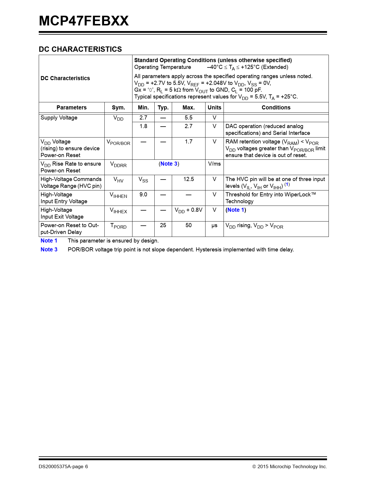 | Páginas / Página | 102 / 6 — MCP47FEBXX. DC CHARACTERISTICS. Standard Operating Conditions (unless … |