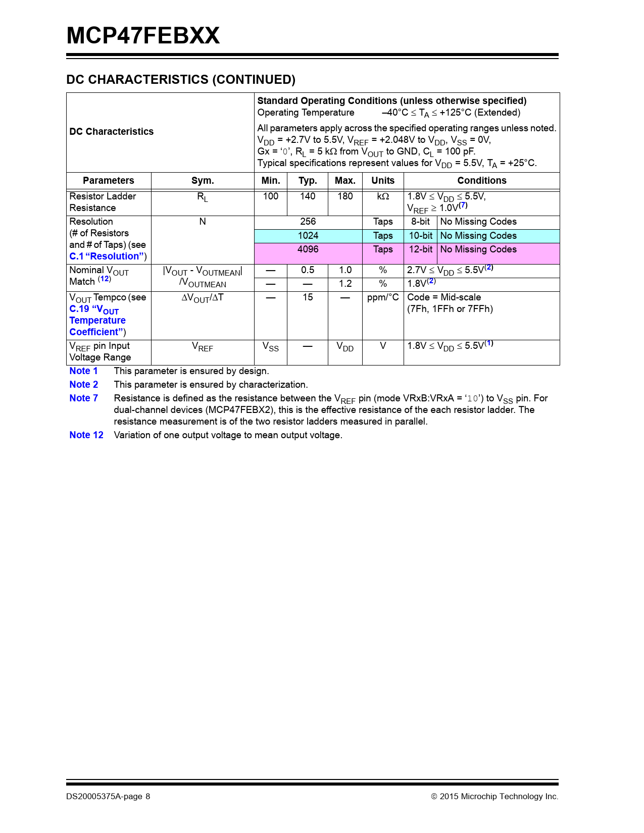 Resistance is defined as the resistance between the VREF pin (mode VRxB:VRxA = ‘10’) to VSS pin. For dual-channel devices (MCP47FEBX2), this is the effective resistance of the each resistor ladder. The resistance measurement is of the two resistor ladders measured in parallel.