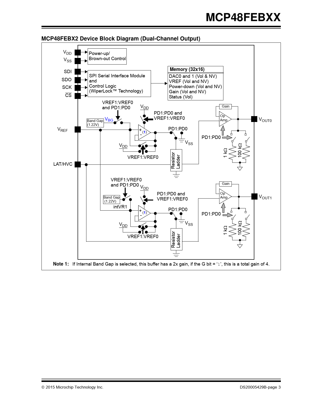 MCP48FEBXX. MCP48FEBX2 Device Block Diagram (Dual-Channel Output). Memory (32x16). Note 1: