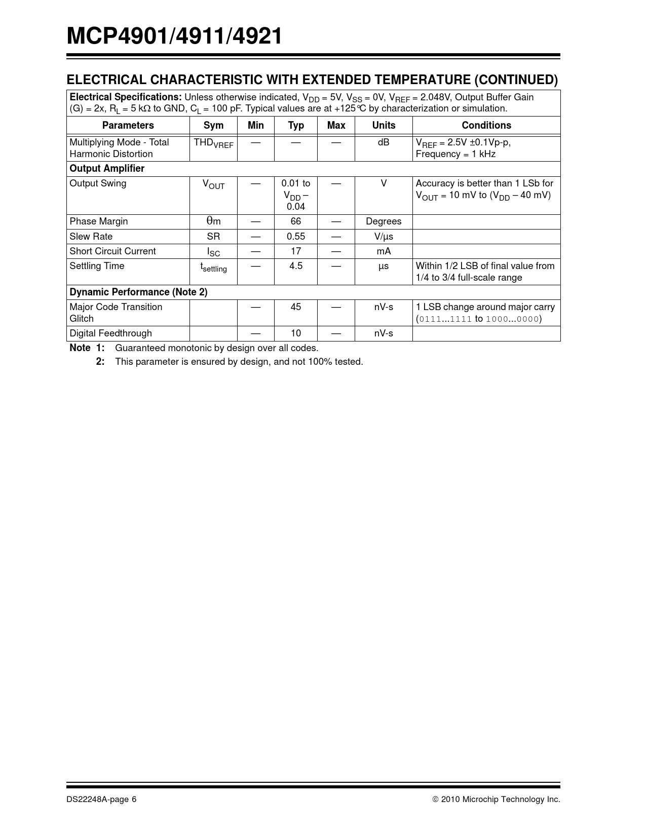 MCP4901/4911/4921 ELECTRICAL CHARACTERISTIC WITH EXTENDED TEMPERATURE (CONTINUED) Electrical Specifications: