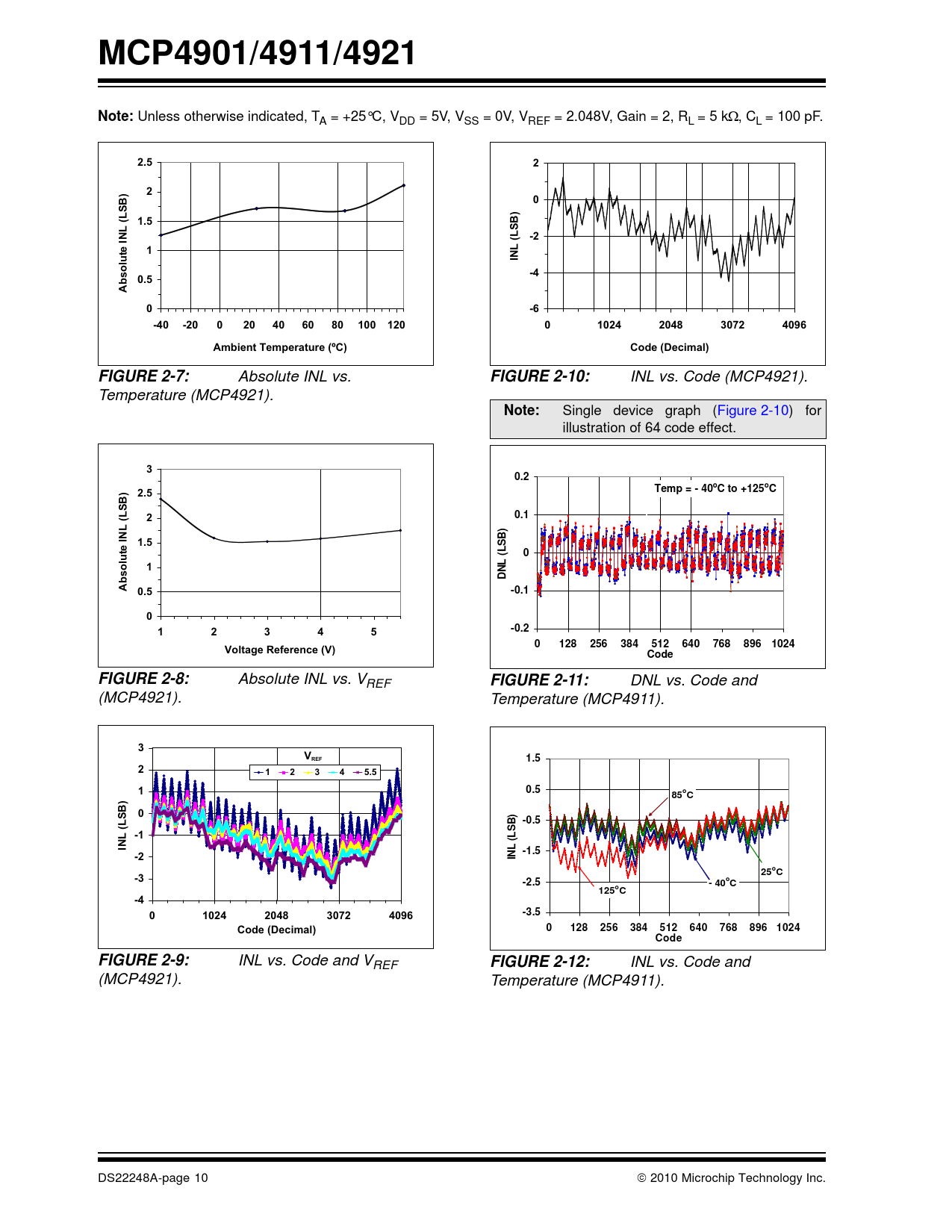 INL vs. Code and (MCP4921). Temperature (MCP4911). DS22248A-page 10  2010 Microchip Technology Inc. Document Outline 1.0 Electrical Characteristics FIGURE 1-1: SPI Input Timing Data. 2.0 Typical Performance Curves FIGURE 2-1: DNL vs. Code (MCP4921). FIGURE 2-2: DNL vs. Code and Temperature (MCP4921). FIGURE 2-3: DNL vs. Code and VREF, Gain=1 (MCP4921). FIGURE 2-4: Absolute DNL vs. Temperature (MCP4921). FIGURE 2-5: Absolute DNL vs. Voltage Reference (MCP4921). FIGURE 2-6: INL vs. Code and Temperature (MCP4921). FIGURE 2-7: Absolute INL vs. Temperature (MCP4921). FIGURE 2-8: Absolute INL vs. VREF (MCP4921). FIGURE 2-9: INL vs. Code and VREF (MCP4921). FIGURE 2-10: INL vs. Code (MCP4921). FIGURE 2-11: DNL vs. Code and Temperature (MCP4911). FIGURE 2-12: INL vs. Code and Temperature (MCP4911). FIGURE 2-13: DNL vs. Code and Temperature (MCP4901). FIGURE 2-14: INL vs. Code and Temperature (MCP4901). FIGURE 2-15: IDD vs. Temperature and VDD. FIGURE 2-16: IDD Histogram (VDD = 2.7V). FIGURE 2-17: IDD Histogram (VDD = 5.0V). FIGURE 2-18: Shutdown Current vs. Temperature and VDD. FIGURE 2-19: Offset Error vs.Temperature and VDD. FIGURE 2-20: Gain Error vs. Temperature and VDD. FIGURE 2-21: VIN High Threshold vs. Temperature and VDD. FIGURE 2-22: VIN Low Threshold vs. Temperature and VDD. FIGURE 2-23: Input Hysteresis vs. Temperature and VDD. FIGURE 2-24: VREF Input Impedance vs. Temperature and VDD. FIGURE 2-25: VOUT High Limit vs. Temperature and VDD. FIGURE 2-26: VOUT Low Limit vs. Temperature and VDD. FIGURE 2-27: IOUT High Short vs. Temperature and VDD. FIGURE 2-28: IOUT vs. VOUT. Gain = 1. FIGURE 2-29: VOUT Rise Time FIGURE 2-30: VOUT Fall Time. FIGURE 2-31: VOUT Rise Time FIGURE 2-32: VOUT Rise Time FIGURE 2-33: VOUT Rise Time Exit Shutdown. FIGURE 2-34: PSRR vs. Frequency. FIGURE 2-35: Multiplier Mode Bandwidth. FIGURE 2-36: -3 db Bandwidth vs. Worst Codes. FIGURE 2-37: Phase Shift. 3.0 Pin Descriptions TABLE 3-1: Pin Function Table 3.1 Supply Voltage Pins (VDD, VSS) 3.2 Chip Select (CS) 3.3 Serial Clock Input (SCK) 3.4 Serial Data Input (SDI) 3.5 Latch DAC Input (LDAC) 3.6 Analog Output (VOUT) 3.7 Voltage Reference Input (VREF) 3.8 Exposed Thermal Pad (EP) 4.0 General Overview TABLE 4-1: LSb of each device 4.1 DC Accuracy FIGURE 4-1: Example for INL Error. FIGURE 4-2: Example for DNL Accuracy. 4.2 Circuit Descriptions FIGURE 4-3: Typical Transient Response. FIGURE 4-4: Output Stage for Shutdown Mode. 5.0 Serial Interface 5.1 Overview 5.2 Write Command FIGURE 5-1: Write Command for MCP4921 (12-bit DAC). FIGURE 5-2: Write Command for MCP4911 (10-bit DAC). Note: X are don’t care bits. FIGURE 5-3: Write Command for MCP4901(8-bit DAC). Note: X are don’t care bits. 6.0 Typical Applications 6.1 Digital Interface 6.2 Power Supply Considerations FIGURE 6-1: Typical Connection Diagram. 6.3 Layout Considerations 6.4 Single-Supply Operation 6.5 Bipolar Operation 6.6 Selectable Gain and Offset Bipolar Voltage Output Using DAC Devices 6.7 Designing a Double-Precision DAC 6.8 Building Programmable Current Source 6.9 Using Multiplier Mode 7.0 Development support 7.1 Evaluation & Demonstration Boards 8.0 Packaging Information 8.1 Package Marking Information Corporate Office Atlanta Boston Chicago Cleveland Fax: 216-447-0643 Dallas Detroit Kokomo Toronto Fax: 852-2401-3431 Australia - Sydney China - Beijing China - Shanghai India - Bangalore Korea - Daegu Korea - Seoul Singapore Taiwan - Taipei Fax: 43-7242-2244-393 Denmark - Copenhagen France - Paris Germany - Munich Italy - Milan Spain - Madrid UK - Wokingham Worldwide Sales and Service