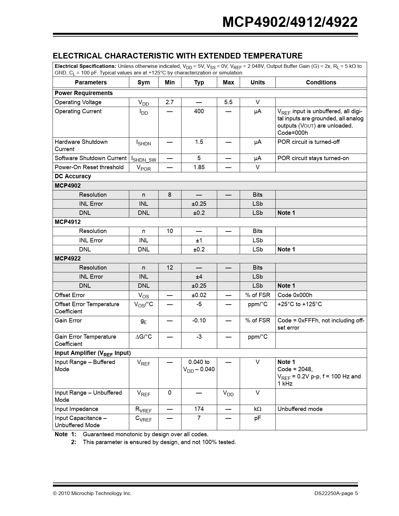 link to page 3 link to page 3 link to page 3 link to page 3 MCP4902/4912/4922ELECTRICAL CHARACTERISTIC WITH EXTENDED TEMPERATUREElectrical Specifications: Unless otherwise indicated, VDD = 5V, VSS = 0V, VREF = 2.048V, Output Buffer Gain (G) = 2x, RL = 5 k to GND, CL = 100 pF. Typical values are at +125°C by characterization or simulation. ParametersSymMinTypMaxUnitsConditionsPower Requirements Operating Voltage VDD 2.7 — 5.5 V Operating Current IDD — 400 — µA VREF input is unbuffered, al digi- tal inputs are grounded, all analog outputs (VOUT) are unloaded. Code=000h Hardware Shutdown ISHDN — 1.5 — µA POR circuit is turned-off Current Software Shutdown Current ISHDN_SW — 5 — µA POR circuit stays turned-on Power-On Reset threshold VPOR — 1.85 — V DC Accuracy MCP4902 Resolution n 8 — — Bits INL Error INL ±0.25 LSb DNL DNL ±0.2 LSb Note 1MCP4912 Resolution n 10 — — Bits INL Error INL ±1 LSb DNL DNL ±0.2 LSb Note 1MCP4922 Resolution n 12 — — Bits INL Error INL ±4 LSb DNL DNL ±0.25 LSb Note 1 Offset Error VOS — ±0.02 — % of FSR Code 0x000h Offset Error Temperature VOS/°C — -5 — ppm/°C +25°C to +125°C Coefficient Gain Error gE — -0.10 — % of FSR Code = 0xFFFh, not including off- set error Gain Error Temperature G/°C — -3 — ppm/°C Coefficient Input Amplifier (VREF Input) Input Range – Buffered VREF — 0.040 to — V Note 1 Mode VDD – 0.040 Code = 2048, VREF = 0.2V p-p, f = 100 Hz and 1 kHz Input Range – Unbuffered VREF 0 — VDD V Mode Input Impedance RVREF — 174 — k Unbuffered mode Input Capacitance – CVREF — 7 — pF Unbuffered Mode Note 1: Guaranteed monotonic by design over all codes. 2: This parameter is ensured by design, and not 100% tested. 2010 Microchip Technology Inc. DS22250A-page 5 Document Outline 1.0 Electrical Characteristics FIGURE 1-1: SPI Input Timing Data. 2.0 Typical Performance Curves FIGURE 2-1: DNL vs. Code (MCP4922). FIGURE 2-2: DNL vs. Code and Temperature (MCP4922). FIGURE 2-3: DNL vs. Code and VREF, Gain = 1 (MCP4922). FIGURE 2-4: Absolute DNL vs. Temperature (MCP4922). FIGURE 2-5: Absolute DNL vs. Voltage Reference (MCP4922). FIGURE 2-6: INL vs. Code and Temperature (MCP4922). FIGURE 2-7: Absolute INL vs. Temperature (MCP4922). FIGURE 2-8: Absolute INL vs. VREF (MCP4922). FIGURE 2-9: INL vs. Code and VREF (MCP4922). FIGURE 2-10: INL vs. Code (MCP4922). FIGURE 2-11: DNL vs. Code and Temperature (MCP4912). FIGURE 2-12: INL vs. Code and Temperature (MCP4912). FIGURE 2-13: DNL vs. Code and Temperature (MCP4902). FIGURE 2-14: INL vs. Code and Temperature (MCP4902). FIGURE 2-15: IDD vs. Temperature and VDD. FIGURE 2-16: IDD Histogram (VDD = 2.7V). FIGURE 2-17: IDD Histogram (VDD = 5.0V). FIGURE 2-18: Hardware Shutdown Current vs. Ambient Temperature and VDD. FIGURE 2-19: Software Shutdown Current vs. Ambient Temperature and VDD. FIGURE 2-20: Offset Error vs. Ambient Temperature and VDD. FIGURE 2-21: Gain Error vs. Ambient Temperature and VDD. FIGURE 2-22: VIN High Threshold vs Ambient Temperature and VDD. FIGURE 2-23: VIN Low Threshold vs Ambient Temperature and VDD. FIGURE 2-24: Input Hysteresis vs. Ambient Temperature and VDD. FIGURE 2-25: VREF Input Impedance vs. Ambient Temperature and VDD. FIGURE 2-26: VOUT High Limit vs. Ambient Temperature and VDD. FIGURE 2-27: VOUT Low Limit vs. Ambient Temperature and VDD. FIGURE 2-28: IOUT High Short vs. Ambient Temperature and VDD. FIGURE 2-29: IOUT vs VOUT. Gain = 1x. FIGURE 2-30: VOUT Rise Time. FIGURE 2-31: VOUT Fall Time. FIGURE 2-32: VOUT Rise Time. FIGURE 2-33: VOUT Rise Time. FIGURE 2-34: VOUT Rise Time Exit Shutdown. FIGURE 2-35: PSRR vs. Frequency. FIGURE 2-36: Multiplier Mode Bandwidth. FIGURE 2-37: -3 db Bandwidth vs. Worst Codes. FIGURE 2-38: Phase Shift. 3.0 Pin Descriptions TABLE 3-1: Pin Function Table 3.1 Supply Voltage Pins (VDD, VSS) 3.2 Chip Select (CS) 3.3 Serial Clock Input (SCK) 3.4 Serial Data Input (SDI) 3.5 Latch DAC Input (LDAC) 3.6 Hardware Shutdown Input (SHDN) 3.7 Analog Outputs (VOUTA, VOUTB) 3.8 Voltage Reference Inputs (VREFA, VREFB) 4.0 General Overview TABLE 4-1: LSb of each device 4.1 DC Accuracy FIGURE 4-1: Example for INL Error. FIGURE 4-2: Example for DNL Accuracy. 4.2 Circuit Descriptions FIGURE 4-3: Typical Transient Response. FIGURE 4-4: Output Stage for Shutdown Mode. 5.0 Serial Interface 5.1 Overview 5.2 Write Command FIGURE 5-1: Write Command for MCP4922 (12-bit DAC). FIGURE 5-2: Write Command for MCP4912 (10-bit DAC). FIGURE 5-3: Write Command for MCP4902 (8-bit DAC). 6.0 Typical Applications 6.1 Digital Interface 6.2 Power Supply Considerations FIGURE 6-1: Typical Connection Diagram. 6.3 Layout Considerations 6.4 Single-Supply Operation 6.5 Bipolar Operation 6.6 Selectable Gain and Offset Bipolar Voltage Output Using a Dual DAC 6.7 Designing a Double-Precision DAC Using a Dual DAC 6.8 Building Programmable Current Source 6.9 Using Multiplier Mode 7.0 Development support 7.1 Evaluation and Demonstration Boards 8.0 Packaging Information 8.1 Package Marking Information Trademarks Worldwide Sales and Service