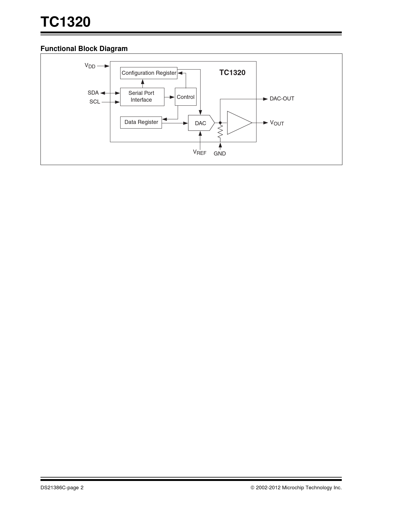 SDA Serial Port Control Interface DAC-OUT SCL Data Register DAC VOUT VREF GND DS21386C-page 2 2002-2012 Microchip Technology Inc.