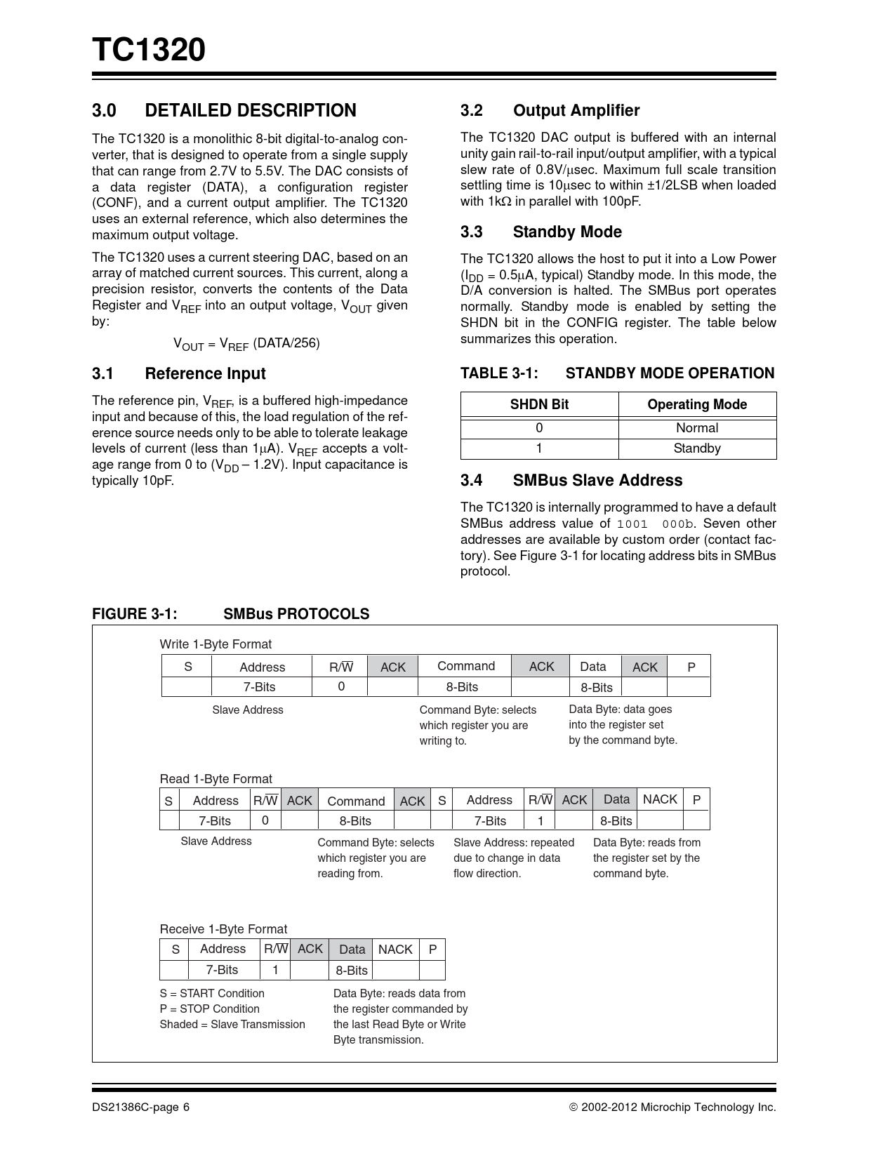 link to page 6 TC13203.0DETAILED DESCRIPTION3.2Output Amplifier The TC1320 is a monolithic 8-bit digital-to-analog con- The TC1320 DAC output is buffered with an internal verter, that is designed to operate from a single supply unity gain rail-to-rail input/output amplifier, with a typical that can range from 2.7V to 5.5V. The DAC consists of slew rate of 0.8V/sec. Maximum full scale transition a data register (DATA), a configuration register settling time is 10sec to within ±1/2LSB when loaded (CONF), and a current output amplifier. The TC1320 with 1k in parallel with 100pF. uses an external reference, which also determines the maximum output voltage. 3.3Standby Mode The TC1320 uses a current steering DAC, based on an The TC1320 allows the host to put it into a Low Power array of matched current sources. This current, along a (IDD = 0.5A, typical) Standby mode. In this mode, the precision resistor, converts the contents of the Data D/A conversion is halted. The SMBus port operates Register and VREF into an output voltage, VOUT given normally. Standby mode is enabled by setting the by: SHDN bit in the CONFIG register. The table below V summarizes this operation. OUT = VREF (DATA/256) 3.1Reference InputTABLE 3-1:STANDBY MODE OPERATION The reference pin, VREF, is a buffered high-impedance SHDN BitOperating Mode input and because of this, the load regulation of the ref- erence source needs only to be able to tolerate leakage 0 Normal levels of current (less than 1A). VREF accepts a volt- 1 Standby age range from 0 to (VDD – 1.2V). Input capacitance is typically 10pF. 3.4SMBus Slave Address The TC1320 is internally programmed to have a default SMBus address value of 1001 000b. Seven other addresses are available by custom order (contact fac- tory). See Figure 3-1 for locating address bits in SMBus protocol. FIGURE 3-1:SMBus PROTOCOLS Write 1-Byte Format S Address R/W ACK Command ACK Data ACK P 7-Bits 0 8-Bits 8-Bits Slave Address Command Byte: selects Data Byte: data goes which register you are into the register set writing to. by the command byte. Read 1-Byte Format S Address R/W ACK Command ACK S Address R/W ACK Data NACK P 7-Bits 0 8-Bits 7-Bits 1 8-Bits Slave Address Command Byte: selects Slave Address: repeated Data Byte: reads from which register you are due to change in data the register set by the reading from. flow direction. command byte. Receive 1-Byte Format S Address R/W ACK Data NACK P 7-Bits 1 8-Bits S = START Condition Data Byte: reads data from P = STOP Condition the register commanded by Shaded = Slave Transmission the last Read Byte or Write Byte transmission. DS21386C-page 6 2002-2012 Microchip Technology Inc.
