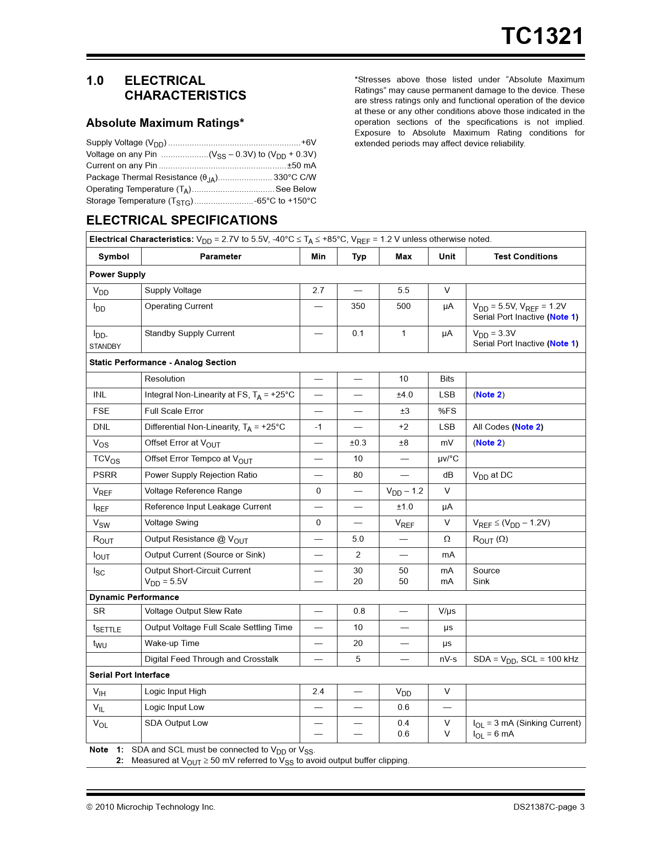 TC1321. 1.0. ELECTRICAL. CHARACTERISTICS. Absolute Maximum Ratings*. ELECTRICAL SPECIFICATIONS. Electrical Characteristics:. Symbol