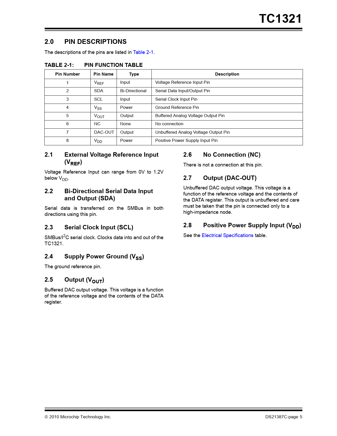 Buffered DAC output voltage. This voltage is a function of the reference voltage and the contents of the DATA register.  2010 Microchip Technology Inc. DS21387C-page 5 Document Outline TC1321 10-Bit Digital-to-Analog Converter with Two-Wire Interface 1.0 Electrical Characteristics 2.0 Pin Descriptions TABLE 2-1: Pin Function Table 2.1 External Voltage Reference Input (VREF) 2.2 Bi-Directional Serial Data Input and Output (SDA) 2.3 Serial Clock Input (SCL) 2.4 Supply Power Ground (VSS) 2.5 Output (VOUT) 2.6 No Connection (NC) 2.7 Output (DAC-OUT) 2.8 Positive Power Supply Input (VDD) 3.0 Detailed Description 3.1 Reference Input 3.2 Output Amplifier 3.3 Standby Mode TABLE 3-1: Standby Mode Operation 3.4 SMBus Slave Address FIGURE 3-1: SMBus/I2C Protocols. 4.0 Serial Port Operation TABLE 4-1: TC1321 Serial Bus Conventions 4.1 START Condition (START) 4.2 Address Byte 4.3 Acknowledge (ACK) 4.4 Data Byte 4.5 Stop Condition (STOP) FIGURE 4-1: SMBus/I2CTiming Diagrams. 4.6 Register Set and Programmer’s Model TABLE 4-2: TC1321 Command Set (READ_BYTE and WRITE_BYTE) TABLE 4-3: Configuration Register (CONFIG), 8-Bit, Read/Write TABLE 4-4: Data Register (DATA), 10-Bit, Read/Write 4.7 Register Set Summary TABLE 4-5: TC1321 Register Set Summary 5.0 Packaging Information 5.1 Package Marking Information Appendix A: Revision History Product Identification System Worldwide Sales and Service