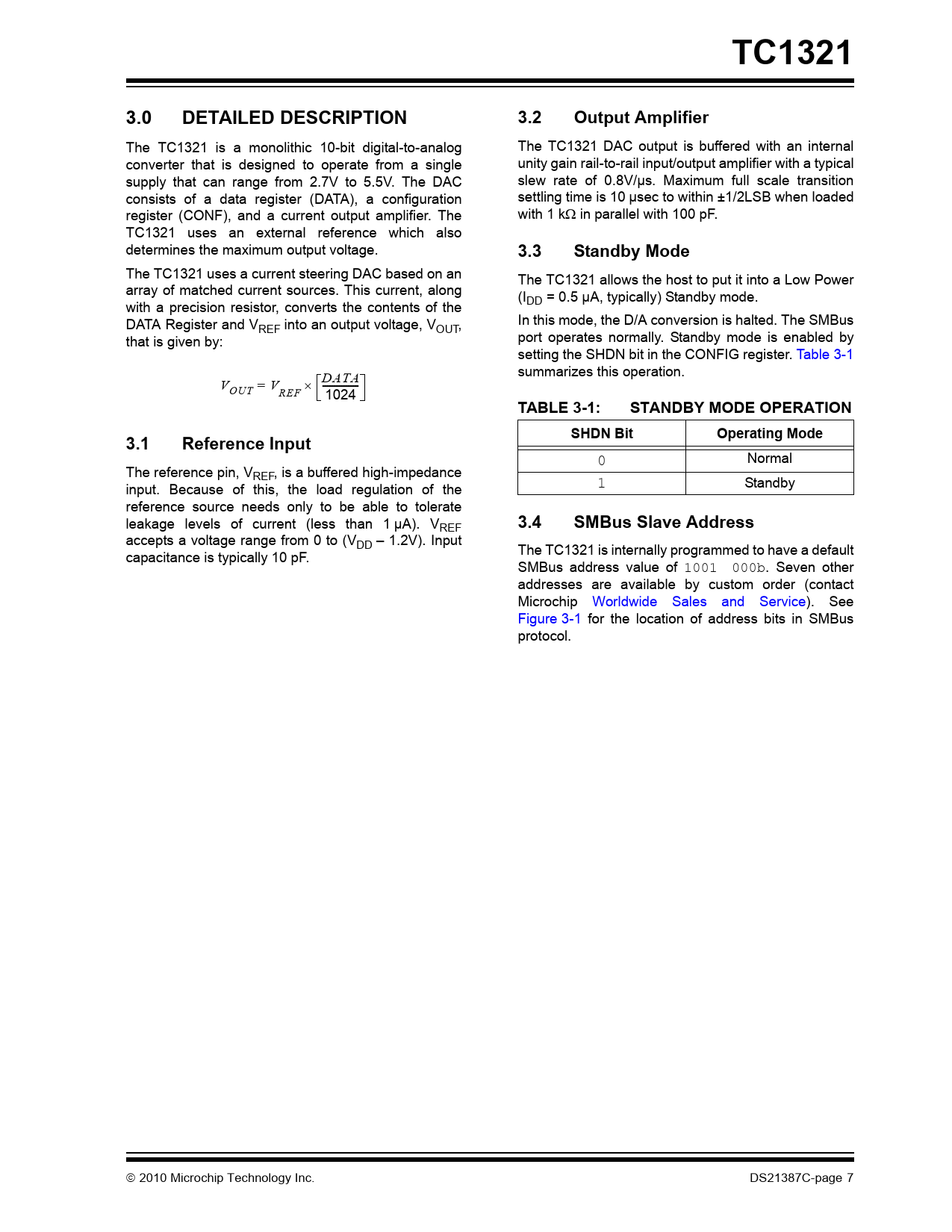 The TC1321 uses a current steering DAC based on an The TC1321 allows the host to put it into a Low Power array of matched current sources. This current, along (I with a precision resistor, converts the contents of the DD = 0.5 µA, typical y) Standby mode. DATA Register and V In this mode, the D/A conversion is halted. The SMBus REF into an output voltage, VOUT, that is given by: port operates normal y. Standby mode is enabled by setting the SHDN bit in the CONFIG register. Table 3-1 summarizes this operation. DATA V  OUT = V -------- REF 1024