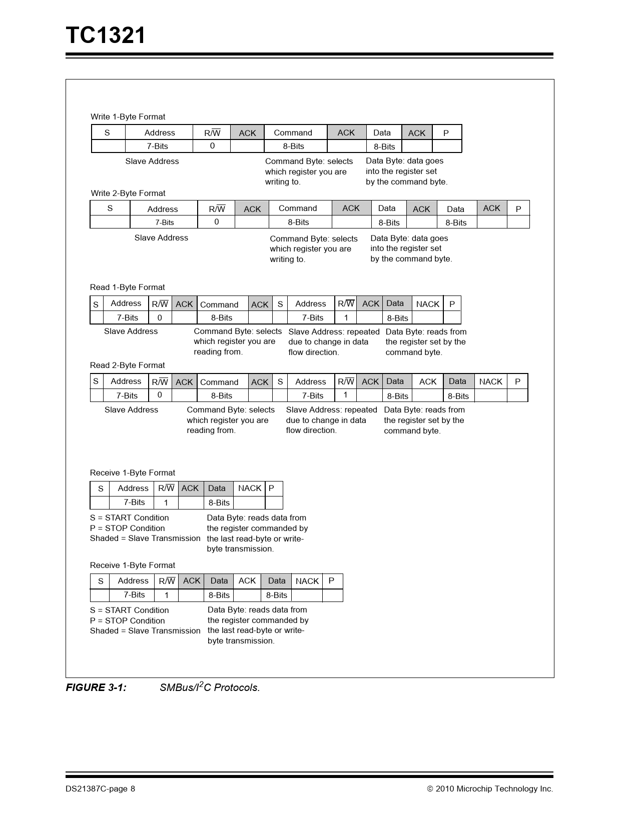 SMBus/I2C Protocols. DS21387C-page 8  2010 Microchip Technology Inc. Document Outline TC1321 10-Bit Digital-to-Analog Converter with Two-Wire Interface 1.0 Electrical Characteristics 2.0 Pin Descriptions TABLE 2-1: Pin Function Table 2.1 External Voltage Reference Input (VREF) 2.2 Bi-Directional Serial Data Input and Output (SDA) 2.3 Serial Clock Input (SCL) 2.4 Supply Power Ground (VSS) 2.5 Output (VOUT) 2.6 No Connection (NC) 2.7 Output (DAC-OUT) 2.8 Positive Power Supply Input (VDD) 3.0 Detailed Description 3.1 Reference Input 3.2 Output Amplifier 3.3 Standby Mode TABLE 3-1: Standby Mode Operation 3.4 SMBus Slave Address FIGURE 3-1: SMBus/I2C Protocols. 4.0 Serial Port Operation TABLE 4-1: TC1321 Serial Bus Conventions 4.1 START Condition (START) 4.2 Address Byte 4.3 Acknowledge (ACK) 4.4 Data Byte 4.5 Stop Condition (STOP) FIGURE 4-1: SMBus/I2CTiming Diagrams. 4.6 Register Set and Programmer’s Model TABLE 4-2: TC1321 Command Set (READ_BYTE and WRITE_BYTE) TABLE 4-3: Configuration Register (CONFIG), 8-Bit, Read/Write TABLE 4-4: Data Register (DATA), 10-Bit, Read/Write 4.7 Register Set Summary TABLE 4-5: TC1321 Register Set Summary 5.0 Packaging Information 5.1 Package Marking Information Appendix A: Revision History Product Identification System Worldwide Sales and Service