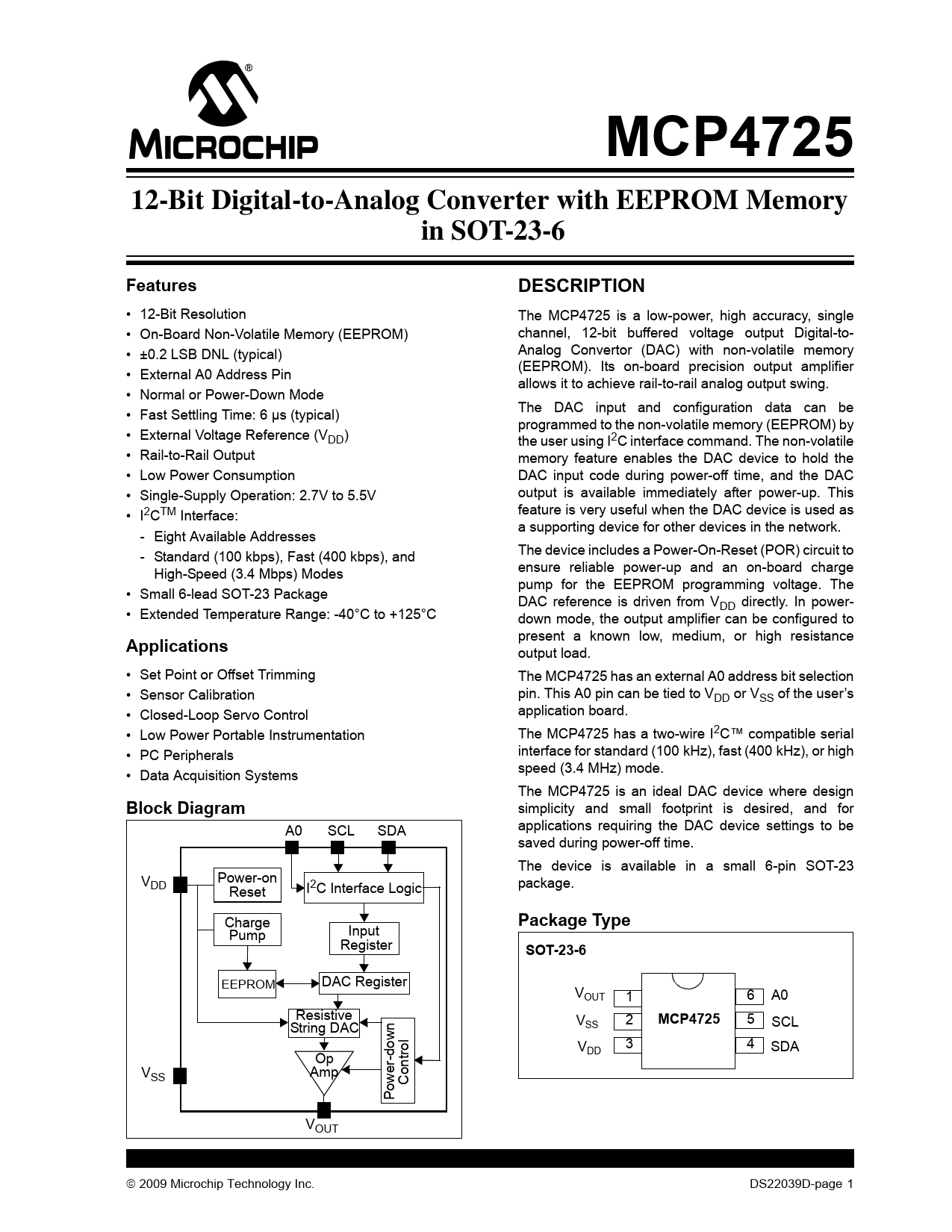 MCP4725. 12-Bit Digital-to-Analog Converter with EEPROM Memory. in SOT-23-6. Features. DESCRIPTION. Applications. Block Diagram