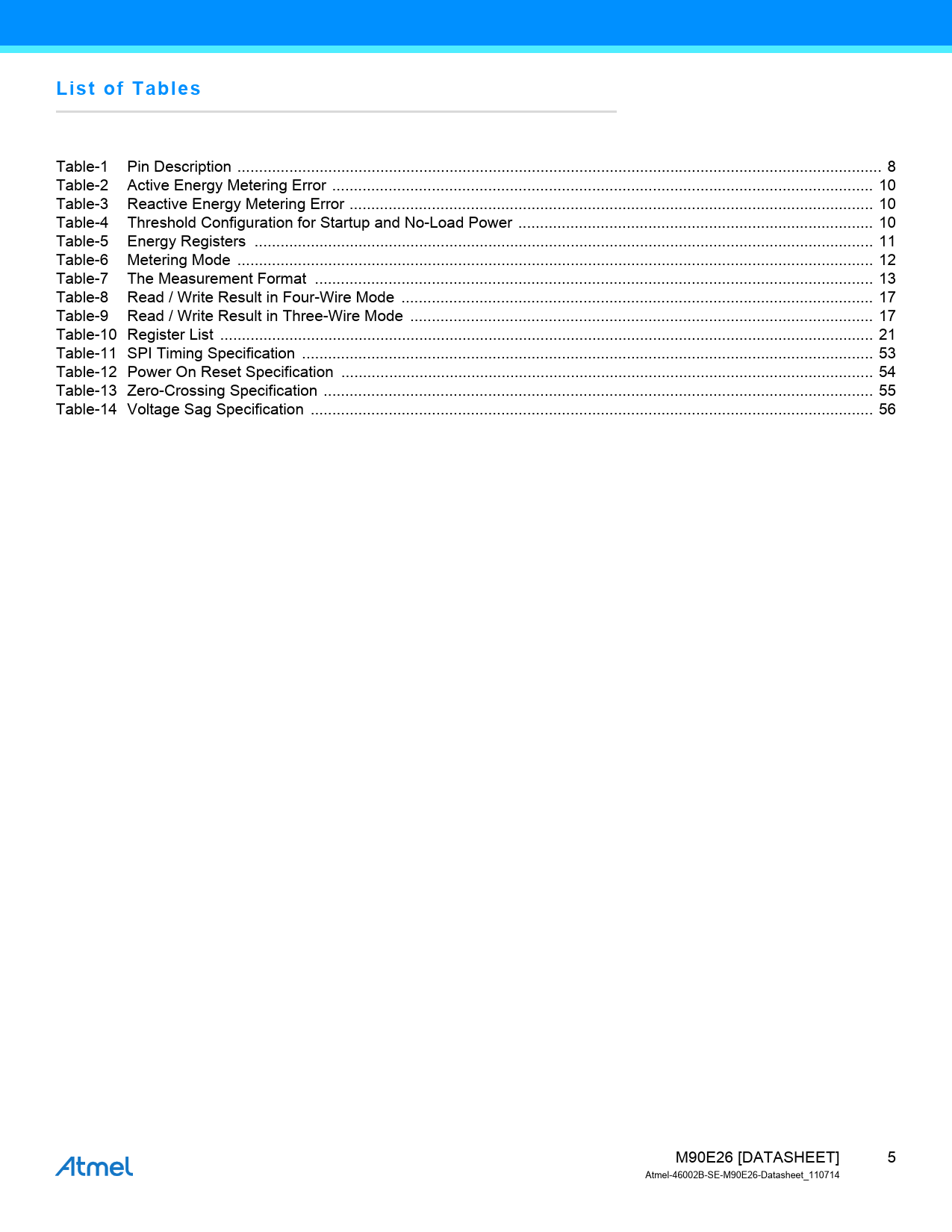 Table-1 Pin Description ... 8 Table-2 Active Energy Metering Error ... 10 Table-3 Reactive Energy Metering Error ... 10 Table-4 Threshold Configuration for Startup and No-Load Power .. 10 Table-5 Energy Registers ... 11 Table-6 Metering Mode ... 12 Table-7 The Measurement Format ... 13 Table-8 Read / Write Result in Four-Wire Mode ... 17 Table-9 Read / Write Result in Three-Wire Mode ... 17 Table-10 Register List ... 21 Table-11 SPI Timing Specification .. 53 Table-12 Power On Reset Specification ... 54 Table-13 Zero-Crossing Specification ... 55 Table-14 Voltage Sag Specification .. 56 M90E26 [DATASHEET] 5 Atmel-46002B-SE-M90E26-Datasheet_110714 Document Outline Features Application Description Block Diagram 1 Pin Assignment 2 Pin Description 3 Functional Description 3.1 Dynamic Metering Range 3.2 Startup and No-Load Power 3.3 Energy Registers 3.4 N Line Metering and Anti-Tampering 3.4.1 Metering Mode and L/N Line Current Sampling Gain Configuration 3.4.2 Anti-Tampering Mode Threshold Compare Method Special Treatment at Low Power 3.5 Measurement and Zero-Crossing 3.5.1 Measurement 3.5.2 Zero-Crossing 3.6 Calibration 3.7 Reset 4 Interface 4.1 SPI Interface 4.1.1 Four-Wire Mode Read Sequence Write Sequence 4.1.2 Three-Wire Mode 4.1.3 Timeout and Protection 4.2 UART Interface 4.2.1 Byte Level Timing 4.2.2 Write Transaction 4.2.3 Read transaction 4.2.4 Checksum 4.3 WarnOut Pin for Fatal Error Warning 4.4 Low Cost Implementation in Isolation with MCU 5 Register 5.1 Register List 5.2 Status and Special Register SoftReset Software Reset SysStatus System Status FuncEn Function Enable SagTh Voltage Sag Threshold SmallPMod Small-Power Mode LastData Last Read/Write SPI/UART Value 5.3 Metering/ Measurement Calibration and Configuration 5.3.1 Metering Calibration and Configuration Register LSB RMS/Power 16-bit LSB CalStart Calibration Start Command PLconstH High Word of PL_Constant PLconstL Low Word of PL_Constant Lgain L Line Calibration Gain Lphi L Line Calibration Angle Ngain N Line Calibration Gain Nphi N Line Calibration Angle PStartTh Active Startup Power Threshold PNolTh Active No-Load Power Threshold QStartTh Reactive Startup Power Threshold QNolTh Reactive No-Load Power Threshold MMode Metering Mode Configuration CS1 Checksum 1 5.3.2 Measurement Calibration Register AdjStart Measurement Calibration Start Command Ugain Voltage rms Gain IgainL L Line Current rms Gain IgainN N Line Current rms Gain Uoffset Voltage Offset IoffsetL L Line Current Offset IoffsetN N Line Current Offset PoffsetL L Line Active Power Offset QoffsetL L Line Reactive Power Offset PoffsetN N Line Active Power Offset QoffsetN N Line Reactive Power Offset CS2 Checksum 2 5.4 Energy Register Theory of Energy Registers APenergy Forward Active Energy ANenergy Reverse Active Energy ATenergy Absolute Active Energy RPenergy Forward (Inductive) Reactive Energy RNenergy Reverse (Capacitive) Reactive Energy RTenergy Absolute Reactive Energy EnStatus Metering Status 5.5 Measurement Register Irms L Line Current rms Urms Voltage rms Pmean L Line Mean Active Power Qmean L Line Mean Reactive Power Freq Voltage Frequency PowerF L Line Power Factor Pangle Phase Angle between Voltage and L Line Current Smean L Line Mean Apparent Power Irms2 N Line Current rms Pmean2 N Line Mean Active Power Qmean2 N Line Mean Reactive Power PowerF2 N Line Power Factor Pangle2 Phase Angle between Voltage and N Line Current Smean2 N Line Mean Apparent Power 6 Electrical Specification 6.1 Electrical Specification 6.2 SPI Interface Timing 6.3 Power On Reset Timing 6.4 Zero-Crossing Timing 6.5 Voltage Sag Timing 6.6 Pulse Output 6.7 Absolute Maximum Rating Ordering Information Packaging Drawings Revision History