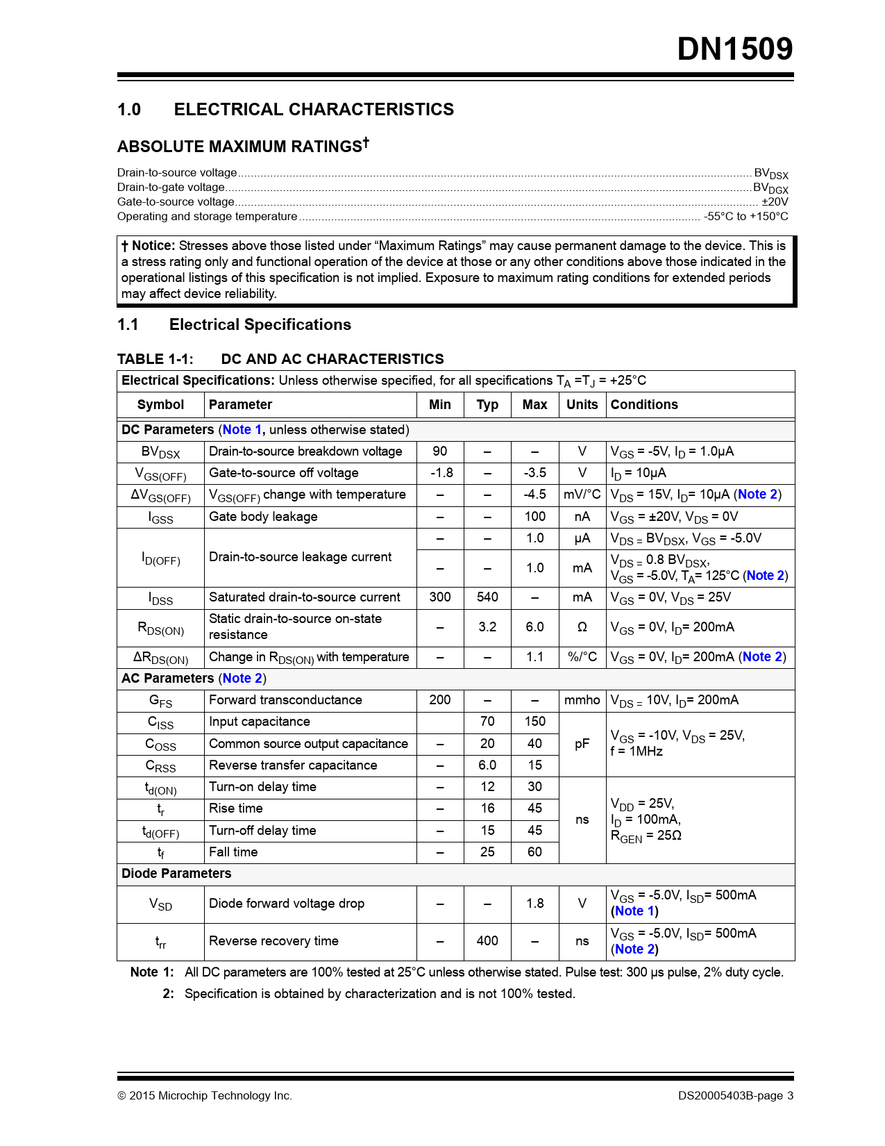 link to page 3 link to page 3 link to page 3 link to page 3 link to page 3 link to page 3 link to page 3 DN15091.0ELECTRICAL CHARACTERISTICSABSOLUTE MAXIMUM RATINGS† Drain-to-source voltage.. BVDSX Drain-to-gate voltage..BVDGX Gate-to-source voltage... ±20V Operating and storage temperature... -55°C to +150°C † Notice: Stresses above those listed under “Maximum Ratings” may cause permanent damage to the device. This is a stress rating only and functional operation of the device at those or any other conditions above those indicated in the operational listings of this specification is not implied. Exposure to maximum rating conditions for extended periods may affect device reliability. 1.1Electrical SpecificationsTABLE 1-1:DC AND AC CHARACTERISTICSElectrical Specifications: Unless otherwise specified, for all specifications TA =TJ = +25°C SymbolParameterMinTypMaxUnits ConditionsDC Parameters ( Note 1, unless otherwise stated) BVDSX Drain-to-source breakdown voltage 90 – – V VGS = -5V, ID = 1.0µA VGS(OFF) Gate-to-source off voltage -1.8 – -3.5 V ID = 10µA ∆VGS(OFF) VGS(OFF) change with temperature – – -4.5 mV/°C VDS = 15V, ID= 10µA ( Note 2 ) IGSS Gate body leakage – – 100 nA VGS = ±20V, VDS = 0V – – 1.0 µA VDS = BVDSX, VGS = -5.0V ID(OFF) Drain-to-source leakage current V – – 1.0 mA DS = 0.8 BVDSX, VGS = -5.0V, TA= 125°C ( Note 2 ) IDSS Saturated drain-to-source current 300 540 – mA VGS = 0V, VDS = 25V Static drain-to-source on-state RDS(ON) – 3.2 6.0 Ω V resistance GS = 0V, ID= 200mA ∆RDS(ON) Change in RDS(ON) with temperature – – 1.1 %/°C VGS = 0V, ID= 200mA ( Note 2 ) AC Parameters ( Note 2 ) GFS Forward transconductance 200 – – mmho VDS = 10V, ID= 200mA CISS Input capacitance 70 150 V C pF GS = -10V, VDS = 25V, OSS Common source output capacitance – 20 40 f = 1MHz CRSS Reverse transfer capacitance – 6.0 15 td(ON) Turn-on delay time – 12 30 V t DD = 25V, r Rise time – 16 45 ns ID = 100mA, td(OFF) Turn-off delay time – 15 45 RGEN = 25Ω tf Fall time – 25 60 Diode Parameters V V GS = -5.0V, ISD= 500mA SD Diode forward voltage drop – – 1.8 V (Note 1) V t GS = -5.0V, ISD= 500mA rr Reverse recovery time – 400 – ns ( Note 2)Note 1: All DC parameters are 100% tested at 25°C unless otherwise stated. Pulse test: 300 µs pulse, 2% duty cycle. 2: Specification is obtained by characterization and is not 100% tested. 2015 Microchip Technology Inc. DS20005403B-page 3 Document Outline 1.0 Electrical Characteristics 1.1 Electrical Specifications TABLE 1-1: DC and AC Characteristics TABLE 1-2: Typical Thermal Resistance TABLE 1-3: Thermal characteristics 2.0 Pin Description TABLE 2-1: Pin Description 3.0 Application Information FIGURE 3-1: Switching Waveforms and Test Circuit 4.0 Packaging Information 4.1 Package Marking Information AMERICAS Corporate Office Atlanta Austin, TX Boston Chicago Cleveland Dallas Detroit Houston, TX Indianapolis Los Angeles New York, NY San Jose, CA Canada - Toronto ASIA/PACIFIC Asia Pacific Office Hong Kong Australia - Sydney China - Beijing China - Chengdu China - Chongqing China - Dongguan China - Hangzhou China - Hong Kong SAR China - Nanjing China - Qingdao China - Shanghai China - Shenyang China - Shenzhen China - Wuhan China - Xian ASIA/PACIFIC China - Xiamen China - Zhuhai India - Bangalore India - New Delhi India - Pune Japan - Osaka Japan - Tokyo Korea - Daegu Korea - Seoul Malaysia - Kuala Lumpur Malaysia - Penang Philippines - Manila Singapore Taiwan - Hsin Chu Taiwan - Kaohsiung Taiwan - Taipei Thailand - Bangkok EUROPE Austria - Wels Denmark - Copenhagen France - Paris Germany - Dusseldorf Germany - Karlsruhe Germany - Munich Italy - Milan Italy - Venice Netherlands - Drunen Poland - Warsaw Spain - Madrid Sweden - Stockholm UK - Wokingham