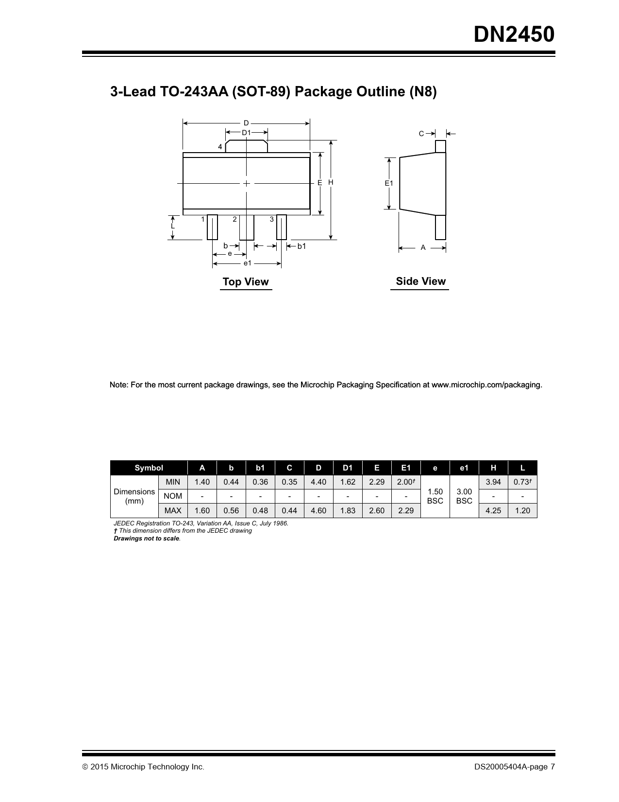DN2450. 3-Lead TO-243AA (SOT-89) Package Outline (N8). Top View. Side View. Symbol. Drawings not to scale