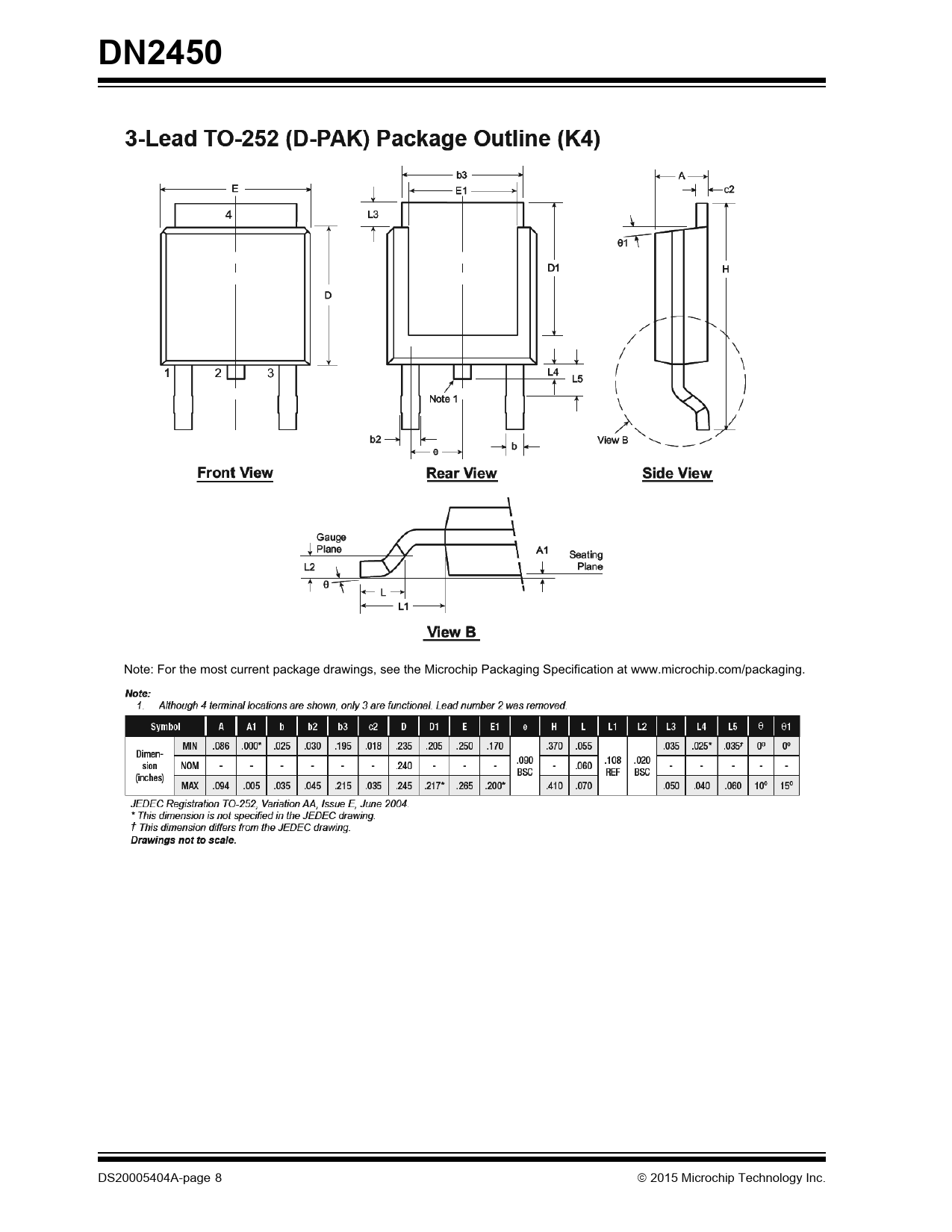 DN2450 Note: For the most current package drawings, see the Microchip Packaging Specification at www.microchip.com/packaging. DS20005404A-page 8 2015 Microchip Technology Inc. Document Outline 1.0 Electrical Characteristics 1.1 ELECTRICAL SPECIFICATIONS TABLE 1-1: DC and AC Characteristics TABLE 1-2: Typical Thermal Resistance TABLE 1-3: Thermal characteristics 2.0 Pin Description TABLE 2-1: Pin Description 3.0 Application Information FIGURE 3-1: Switching Waveforms and Test Circuit 4.0 Packaging Information 4.1 Package Marking Information AMERICAS Corporate Office Atlanta Austin, TX Boston Chicago Cleveland Dallas Detroit Houston, TX Noblesville, IN Los Angeles New York, NY San Jose, CA Canada - Toronto ASIA/PACIFIC Asia Pacific Office Hong Kong Australia - Sydney China - Beijing China - Chengdu China - Chongqing China - Dongguan China - Hangzhou China - Hong Kong SAR China - Nanjing China - Qingdao China - Shanghai China - Shenyang China - Shenzhen China - Wuhan China - Xian ASIA/PACIFIC China - Xiamen China - Zhuhai India - Bangalore India - New Delhi India - Pune Japan - Osaka Japan - Tokyo Korea - Daegu Korea - Seoul Malaysia - Kuala Lumpur Malaysia - Penang Philippines - Manila Singapore Taiwan - Hsin Chu Taiwan - Kaohsiung Taiwan - Taipei Thailand - Bangkok EUROPE Austria - Wels Denmark - Copenhagen France - Paris Germany - Dusseldorf Germany - Munich Germany - Pforzheim Italy - Milan Italy - Venice Netherlands - Drunen Poland - Warsaw Spain - Madrid Sweden - Stockholm UK - Wokingham
