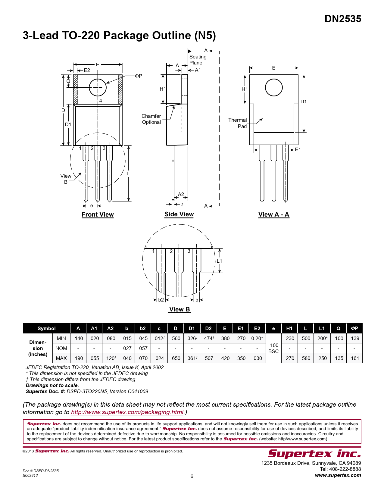 | Páginas / Página | 6 / 6 — DN2535. 3-Lead TO-220 Package Outline (N5). Front View. Side View. View A … |