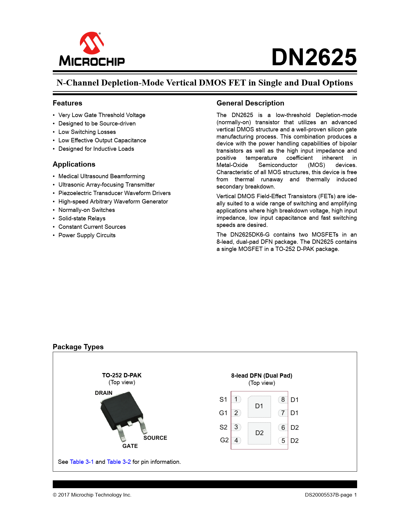 link to page 6 link to page 6 DN2625N-Channel Depletion-Mode Vertical DMOS FET in Single and Dual OptionsFeaturesGeneral Description • Very Low Gate Threshold Voltage The DN2625 is a low-threshold Depletion-mode • Designed to be Source-driven (normally-on) transistor that utilizes an advanced • Low Switching Losses vertical DMOS structure and a well-proven silicon gate manufacturing process. This combination produces a • Low Effective Output Capacitance device with the power handling capabilities of bipolar • Designed for Inductive Loads transistors as well as the high input impedance and positive temperature coefficient inherent in Applications Metal-Oxide Semiconductor (MOS) devices. Characteristic of all MOS structures, this device is free • Medical Ultrasound Beamforming from thermal runaway and thermally induced • Ultrasonic Array-focusing Transmitter secondary breakdown. • Piezoelectric Transducer Waveform Drivers Vertical DMOS Field-Effect Transistors (FETs) are ide- • High-speed Arbitrary Waveform Generator ally suited to a wide range of switching and amplifying • Normally-on Switches applications where high breakdown voltage, high input • Solid-state Relays impedance, low input capacitance and fast switching • Constant Current Sources speeds are desired. • Power Supply Circuits The DN2625DK6-G contains two MOSFETs in an 8-lead, dual-pad DFN package. The DN2625 contains a single MOSFET in a TO-252 D-PAK package. Package TypesTO-252 D-PAK8-lead DFN (Dual Pad) (Top view) (Top view) DRAIN S1 1 8 D1 D1 G1 2 7 D1 S2 3 6 D2 D2 SOURCE G2 4 5 D2 GATE See Table 3-1 and Table 3-2 for pin information. 2017 Microchip Technology Inc. DS20005537B-page 1 Document Outline 1.0 Electrical Characteristics Absolute Maximum Ratings† Temperature Specifications Thermal characteristics 2.0 Typical Performance Curves FIGURE 2-1: Output Characteristics. FIGURE 2-2: Transfer Characteristics. FIGURE 2-3: Saturation Characteristics. FIGURE 2-4: BVDSX Variation with Temperature. FIGURE 2-5: On-resistance vs. Drain Current. FIGURE 2-6: VGS(OFF) and RDS(ON) Variation with Temperature. FIGURE 2-7: Transconductance vs. Drain Current. 3.0 Pin Description TABLE 3-1: TO-252 D-PAK Pin Function Table TABLE 3-2: 8-lead DFN (dual Pad) Pin Function Table 4.0 Functional Description FIGURE 4-1: Switching Waveforms and Test Circuit. Product Summary 5.0 Packaging Information 5.1 Package Marking Information