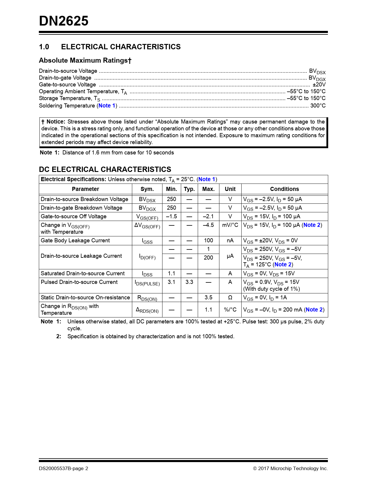DN2625. 1.0. ELECTRICAL CHARACTERISTICS. Absolute Maximum Ratings†. Note 1. Notice:. Note 1:. DC ELECTRICAL CHARACTERISTICS