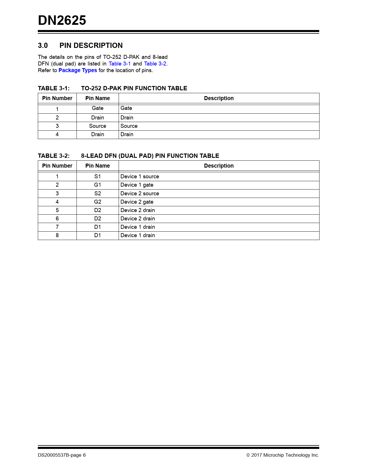 DN2625. 3.0. PIN DESCRIPTION. Package Types. TABLE 3-1:. TO-252 D-PAK PIN FUNCTION TABLE. Pin Number. Pin Name. Description. TABLE 3-2: