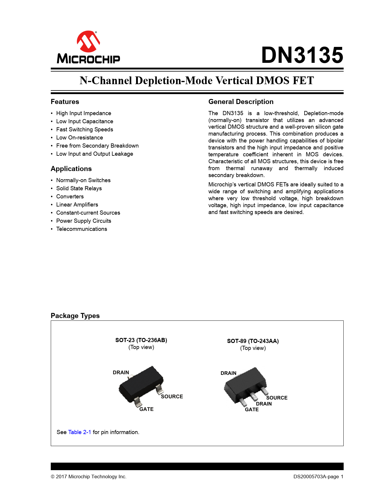 DN3135. N-Channel Depletion-Mode Vertical DMOS FET. Features. General Description. Applications. Package Types. SOT-23 (TO-236AB)