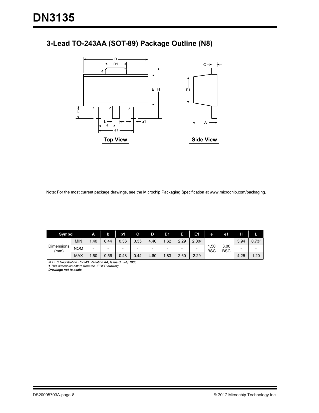 DN3135. 3-Lead TO-243AA (SOT-89) Package Outline (N8). Top View. Side View. Symbol. Drawings not to scale