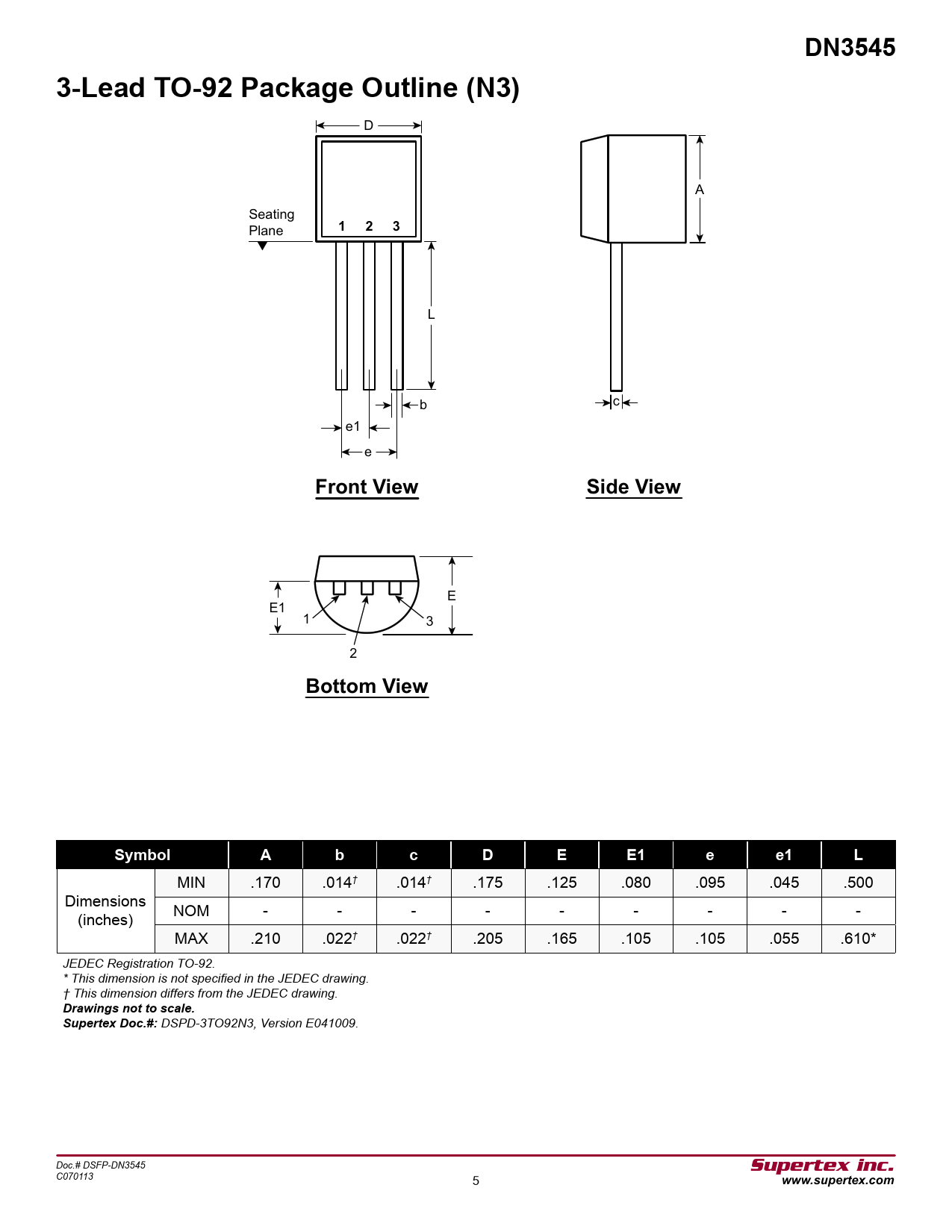 DN3545 3-Lead TO-92 Package Outline (N3) 1 2 3 Front View Side View Bottom View Symbol Drawings not to scale Supertex Doc.#: