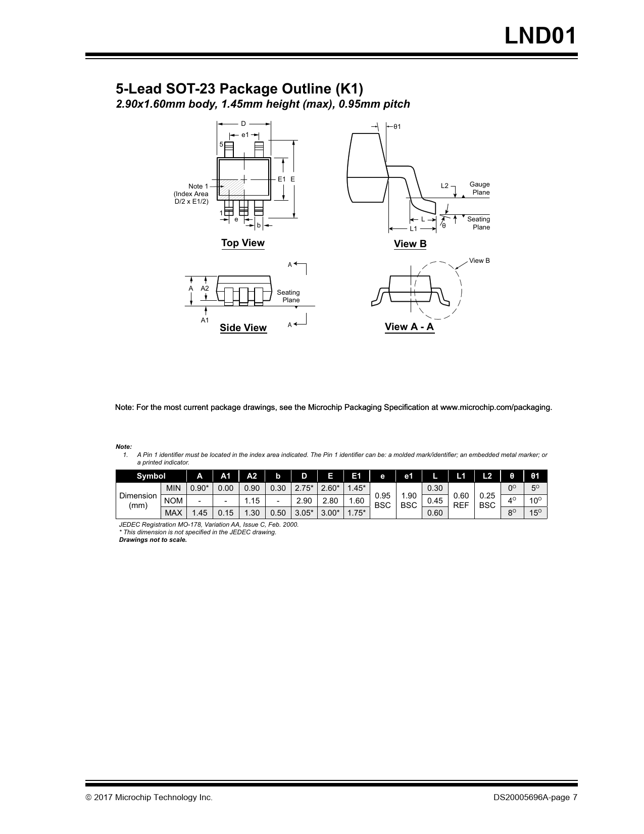 LND015-Lead SOT-23 Package Outline (K1) 2.90x1.60mm body, 1.45mm height (max), 0.95mm pitch D θ1 e1 5 E1 E Gauge Note 1 L2 (Index Area Plane D/2 x E1/2) 1 e L Seating b θ Plane L1 Top ViewView B View B A A A2 Seating Plane A1 Side View A View A - A Note: For the most current package drawings, see the Microchip Packaging Specification at www.microchip.com/packaging. Note: 1. $3LQLGHQWL¿HUPXVWEHORFDWHGLQWKHLQGH[DUHDLQGLFDWHG7KH3LQLGHQWL¿HUFDQEHDPROGHGPDUNLGHQWL¿HUDQHPEHGGHGPHWDOPDUNHURU a printed indicator. SymbolAA1A2bDEE1ee1LL1L2șș MIN 0.90* 0.00 0.90 0.30 2.75* 2.60* 1.45* 0.30 0O 5O Dimension 0.95 1.90 0.60 0.25 NOM - - 1.15 - 2.90 2.80 1.60 0.45 4O 10O (mm) BSC BSC REF BSC MAX 1.45 0.15 1.30 0.50 3.05* 3.00* 1.75* 0.60 8O 15O JEDEC Registration MO-178, Variation AA, Issue C, Feb. 2000. 7KLVGLPHQVLRQLVQRWVSHFL¿HGLQWKH-('(&GUDZLQJ Drawings not to scale. 2017 Microchip Technology Inc. DS20005696A-page 7 Document Outline 1.0 Electrical Characteristics 2.0 Pin Description TABLE 2-1: Pin Function Table 3.0 Functional Description FIGURE 3-1: Switching Waveforms and Test Circuit. TABLE 3-1: Product Summary 4.0 Packaging Information 4.1 Package Marking Information