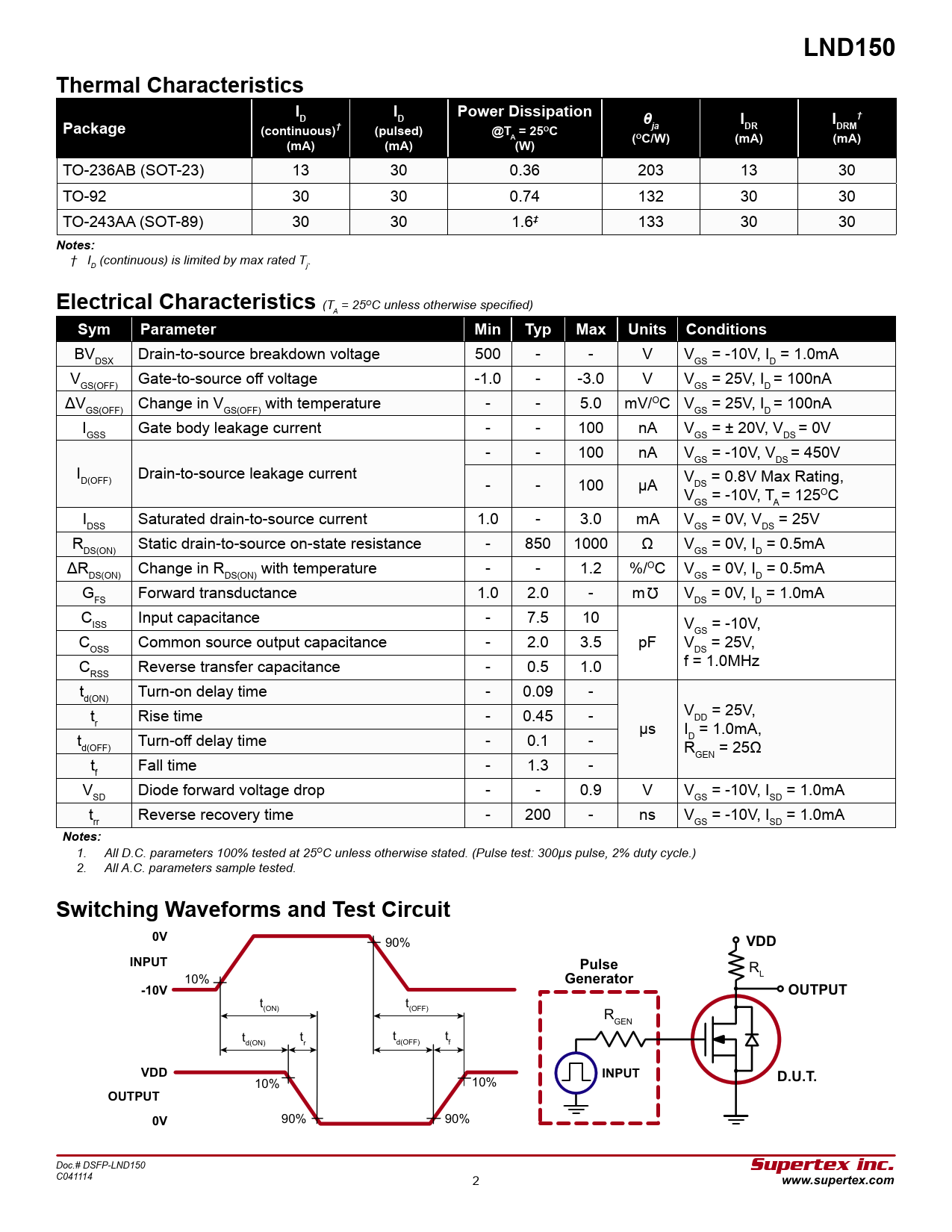 LND150. Thermal CharacteristicsI. Power Dissipation. Package. (continuous)†. (pulsed). @T = 25OC. DRM. (mA). (W). (OC/W). Notes: