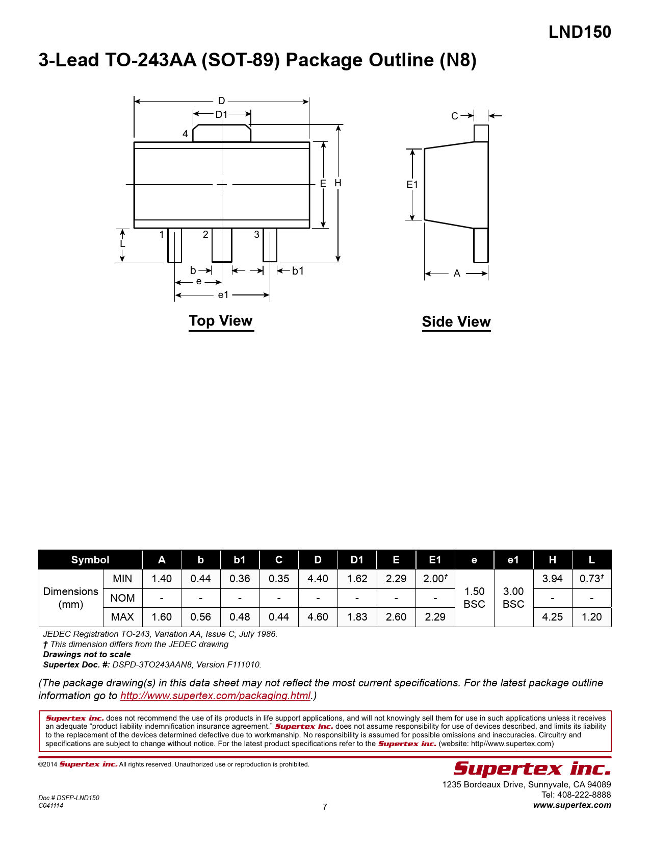 LND150. 3-Lead TO-243AA (SOT-89) Package Outline (N8). Vqr"Xkgy. Ukfg"Xkgy. Symbol. Drawings not to scale. Supertex Doc. #: