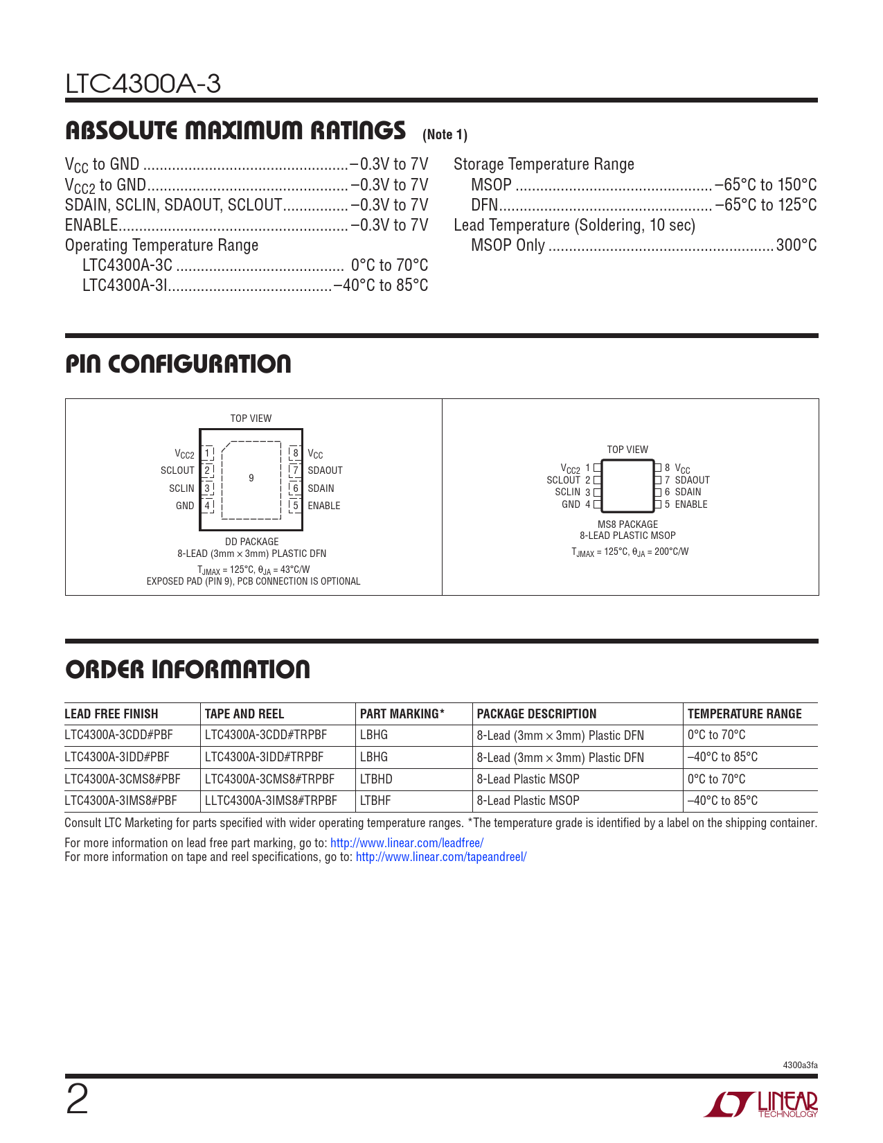 VCC to GND ..–0.3V to 7V Storage Temperature Range VCC2 to GND ... –0.3V to 7V MSOP .. –65°C to 150°C SDAIN, SCLIN, SDAOUT, SCLOUT .. –0.3V to 7V DFN .. –65°C to 125°C ENABLE .. –0.3V to 7V Lead Temperature (Soldering, 10 sec) Operating Temperature Range MSOP Only ...300°C LTC4300A-3C ... 0°C to 70°C LTC4300A-3I..–40°C to 85°C