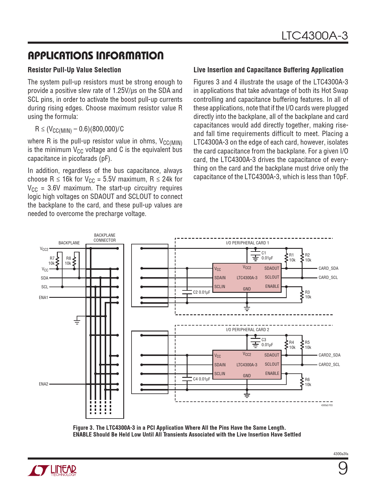LTC4300A-3 applicaTions inForMaTion Resistor Pull-Up Value SelectionLive Insertion and Capacitance Buffering Application The system pull-up resistors must be strong enough to Figures 3 and 4 illustrate the usage of the LTC4300A-3 provide a positive slew rate of 1.25V/µs on the SDA and in applications that take advantage of both its Hot Swap SCL pins, in order to activate the boost pull-up currents controlling and capacitance buffering features. In all of during rising edges. Choose maximum resistor value R these applications, note that if the I/O cards were plugged using the formula: directly into the backplane, all of the backplane and card R ≤ (V capacitances would add directly together, making rise- CC(MIN) – 0.6)(800,000)/C and fal time requirements difficult to meet. Placing a where R is the pull-up resistor value in ohms, VCC(MIN) LTC4300A-3 on the edge of each card, however, isolates is the minimum VCC voltage and C is the equivalent bus the card capacitance from the backplane. For a given I/O capacitance in picofarads (pF). card, the LTC4300A-3 drives the capacitance of every- In addition, regardless of the bus capacitance, always thing on the card and the backplane must drive only the choose R ≤ 16k for V capacitance of the LTC4300A-3, which is less than 10pF. CC = 5.5V maximum, R ≤ 24k for VCC = 3.6V maximum. The start-up circuitry requires logic high voltages on SDAOUT and SCLOUT to connect the backplane to the card, and these pull-up values are needed to overcome the precharge voltage. BACKPLANE BACKPLANE CONNECTOR I/O PERIPHERAL CARD 1 VCC2 C1 R1 R2 R7 R8 0.01µF 10k 10k 10k 10k V V V CC CC CC2 SDAOUT CARD_SDA SDA SDAIN LTC4300A-3 SCLOUT CARD_SCL SCL SCLIN GND ENABLE C2 0.01µF R3 ENA1 10k I/O PERIPHERAL CARD 2 C3 R4 R5 0.01µF 10k 10k V V CC CC2 SDAOUT CARD2_SDA SDAIN LTC4300A-3 SCLOUT CARD2_SCL SCLIN GND ENABLE C4 0.01µF R6 ENA2 10k 4300a3 F03 Figure 3. The LTC4300A-3 in a PCI Application Where All the Pins Have the Same Length.ENABLE Should Be Held Low Until All Transients Associated with the Live Insertion Have Settled 4300a3fa 9 Document Outline Features Applications Description Typical Application Absolute Maximum Ratings Pin Configuration Order Information Electrical Characteristics Typical Performance Characteristics Pin Functions Block Diagram Operation Applications Information Package Description Revision History Related Parts Typical Application