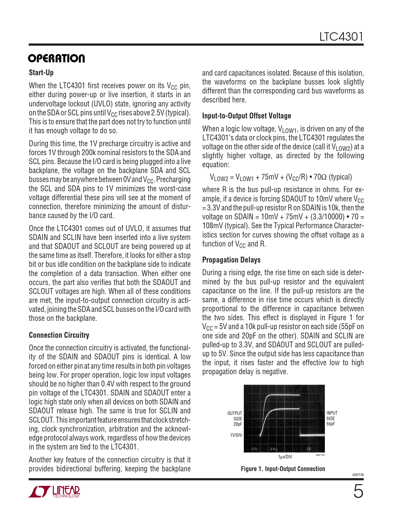 LTC4301 UOPERATIOStart-Up and card capacitances isolated. Because of this isolation, the waveforms on the backplane busses look slightly When the LTC4301 first receives power on its VCC pin, different than the corresponding card bus waveforms as either during power-up or live insertion, it starts in an described here. undervoltage lockout (UVLO) state, ignoring any activity on the SDA or SCL pins until VCC rises above 2.5V (typical). Input-to-Output Offset Voltage This is to ensure that the part does not try to function until it has enough voltage to do so. When a logic low voltage, VLOW1, is driven on any of the LTC4301’s data or clock pins, the LTC4301 regulates the During this time, the 1V precharge circuitry is active and voltage on the other side of the device (call it VLOW2) at a forces 1V through 200k nominal resistors to the SDA and slightly higher voltage, as directed by the following SCL pins. Because the I/O card is being plugged into a live equation: backplane, the voltage on the backplane SDA and SCL busses may be anywhere between 0V and V V CC. Precharging LOW2 = VLOW1 + 75mV + (VCC/R) • 70Ω (typical) the SCL and SDA pins to 1V minimizes the worst-case where R is the bus pull-up resistance in ohms. For ex- voltage differential these pins will see at the moment of ample, if a device is forcing SDAOUT to 10mV where VCC connection, therefore minimizing the amount of distur- = 3.3V and the pull-up resistor R on SDAIN is 10k, then the bance caused by the I/O card. voltage on SDAIN = 10mV + 75mV + (3.3/10000) • 70 = Once the LTC4301 comes out of UVLO, it assumes that 108mV (typical). See the Typical Performance Character- SDAIN and SCLIN have been inserted into a live system istics section for curves showing the offset voltage as a and that SDAOUT and SCLOUT are being powered up at function of VCC and R. the same time as itself. Therefore, it looks for either a stop Propagation Delays bit or bus idle condition on the backplane side to indicate the completion of a data transaction. When either one During a rising edge, the rise time on each side is deter- occurs, the part also verifies that both the SDAOUT and mined by the bus pull-up resistor and the equivalent SCLOUT voltages are high. When all of these conditions capacitance on the line. If the pull-up resistors are the are met, the input-to-output connection circuitry is acti- same, a difference in rise time occurs which is directly vated, joining the SDA and SCL busses on the I/O card with proportional to the difference in capacitance between those on the backplane. the two sides. This effect is displayed in Figure 1 for VCC = 5V and a 10k pull-up resistor on each side (55pF on Connection Circuitry one side and 20pF on the other). SDAIN and SCLIN are Once the connection circuitry is activated, the functional- pulled-up to 3.3V, and SDAOUT and SCLOUT are pulled- ity of the SDAIN and SDAOUT pins is identical. A low up to 5V. Since the output side has less capacitance than forced on either pin at any time results in both pin voltages the input, it rises faster and the effective low to high being low. For proper operation, logic low input voltages propagation delay is negative. should be no higher than 0.4V with respect to the ground pin voltage of the LTC4301. SDAIN and SDAOUT enter a logic high state only when all devices on both SDAIN and SDAOUT release high. The same is true for SCLIN and OUTPUT INPUT SCLOUT. This important feature ensures that clock stretch- SIDE SIDE 20pF 55pF ing, clock synchronization, arbitration and the acknowl- edge protocol always work, regardless of how the devices 1V/DIV in the system are tied to the LTC4301. 4301 F01 Another key feature of the connection circuitry is that it 1µs/DIV provides bidirectional buffering, keeping the backplane Figure 1. Input-Output Connection 4301fb 5