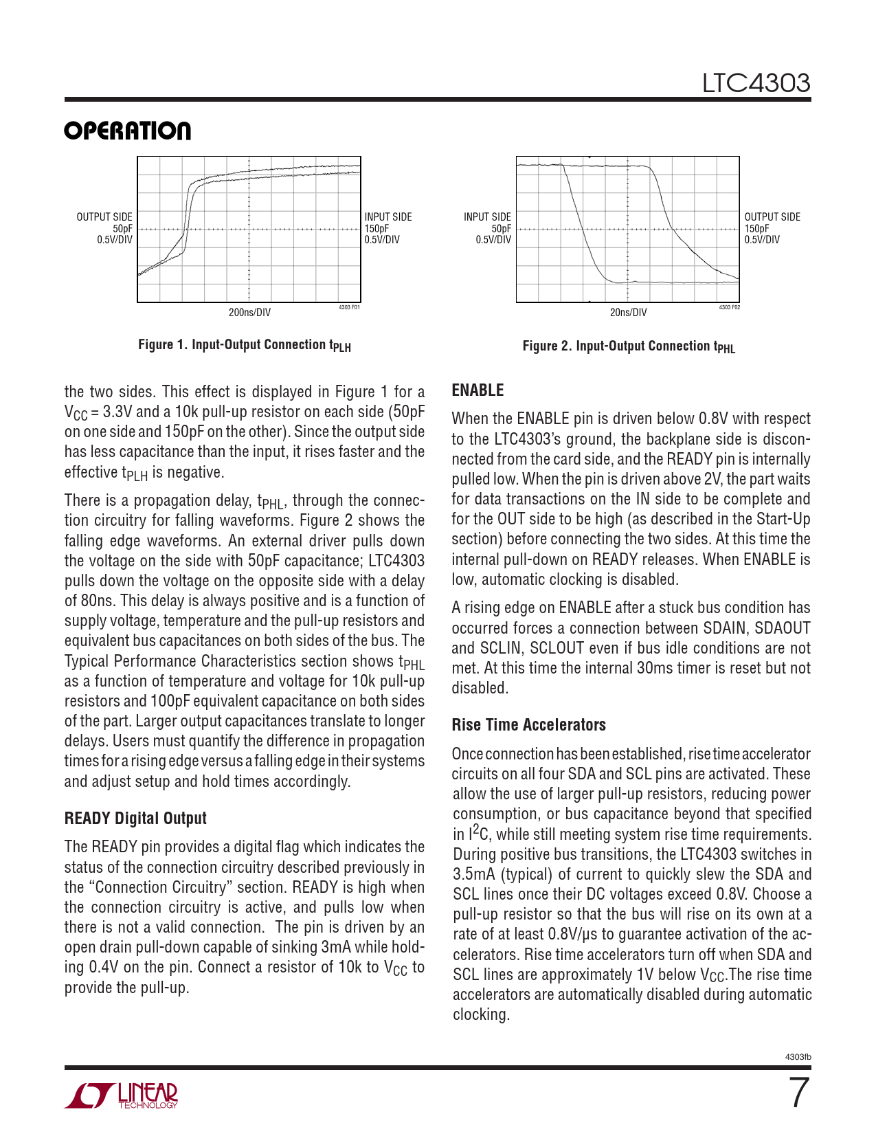 VCC = 3.3V and a 10k pull-up resistor on each side (50pF When the ENABLE pin is driven below 0.8V with respect on one side and 150pF on the other). Since the output side to the LTC4303’s ground, the backplane side is discon- has less capacitance than the input, it rises faster and the nected from the card side, and the READY pin is internally effective tPLH is negative. pulled low. When the pin is driven above 2V, the part waits There is a propagation delay, tPHL, through the connec- for data transactions on the IN side to be complete and tion circuitry for falling waveforms. Figure 2 shows the for the OUT side to be high (as described in the Start-Up falling edge waveforms. An external driver pulls down section) before connecting the two sides. At this time the the voltage on the side with 50pF capacitance; LTC4303 internal pull-down on READY releases. When ENABLE is pulls down the voltage on the opposite side with a delay low, automatic clocking is disabled. of 80ns. This delay is always positive and is a function of A rising edge on ENABLE after a stuck bus condition has supply voltage, temperature and the pull-up resistors and occurred forces a connection between SDAIN, SDAOUT equivalent bus capacitances on both sides of the bus. The and SCLIN, SCLOUT even if bus idle conditions are not Typical Performance Characteristics section shows tPHL met. At this time the internal 30ms timer is reset but not as a function of temperature and voltage for 10k pull-up disabled. resistors and 100pF equivalent capacitance on both sides of the part. Larger output capacitances translate to longer