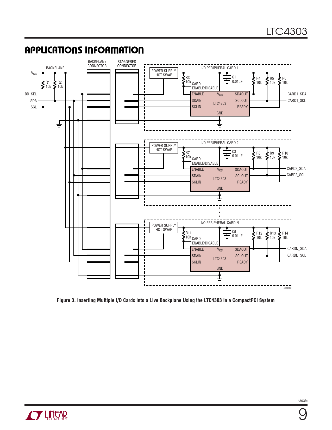 BACKPLANE STAGGERED CONNECTOR CONNECTOR BACKPLANE I/O PERIPHERAL CARD 1 POWER SUPPLY VCC HOT SWAP R3 C1 R4 R5 R6 R1 R2 10k 0.01µF 10k 10k 10k CARD 10k 10k ENABLE/DISABLE BD_SEL ENABLE V SDAOUT CARD1_SDA CC SDA SDAIN SCLOUT CARD1_SCL LTC4303 SCL SCLIN READY GND I/O PERIPHERAL CARD 2 POWER SUPPLY HOT SWAP R7 C3 R8 R9 R10 10k 0.01µF 10k 10k 10k CARD ENABLE/DISABLE CARD2_SDA ENABLE VCC SDAOUT CARD2_SCL SDAIN SCLOUT LTC4303 SCLIN READY GND • • • I/O PERIPHERAL CARD N POWER SUPPLY HOT SWAP R11 C5 R12 R13 R14 10k 0.01µF 10k 10k 10k CARD ENABLE/DISABLE CARDN_SDA ENABLE VCC SDAOUT SDAIN SCLOUT CARDN_SCL LTC4303 SCLIN READY GND 4303 F03