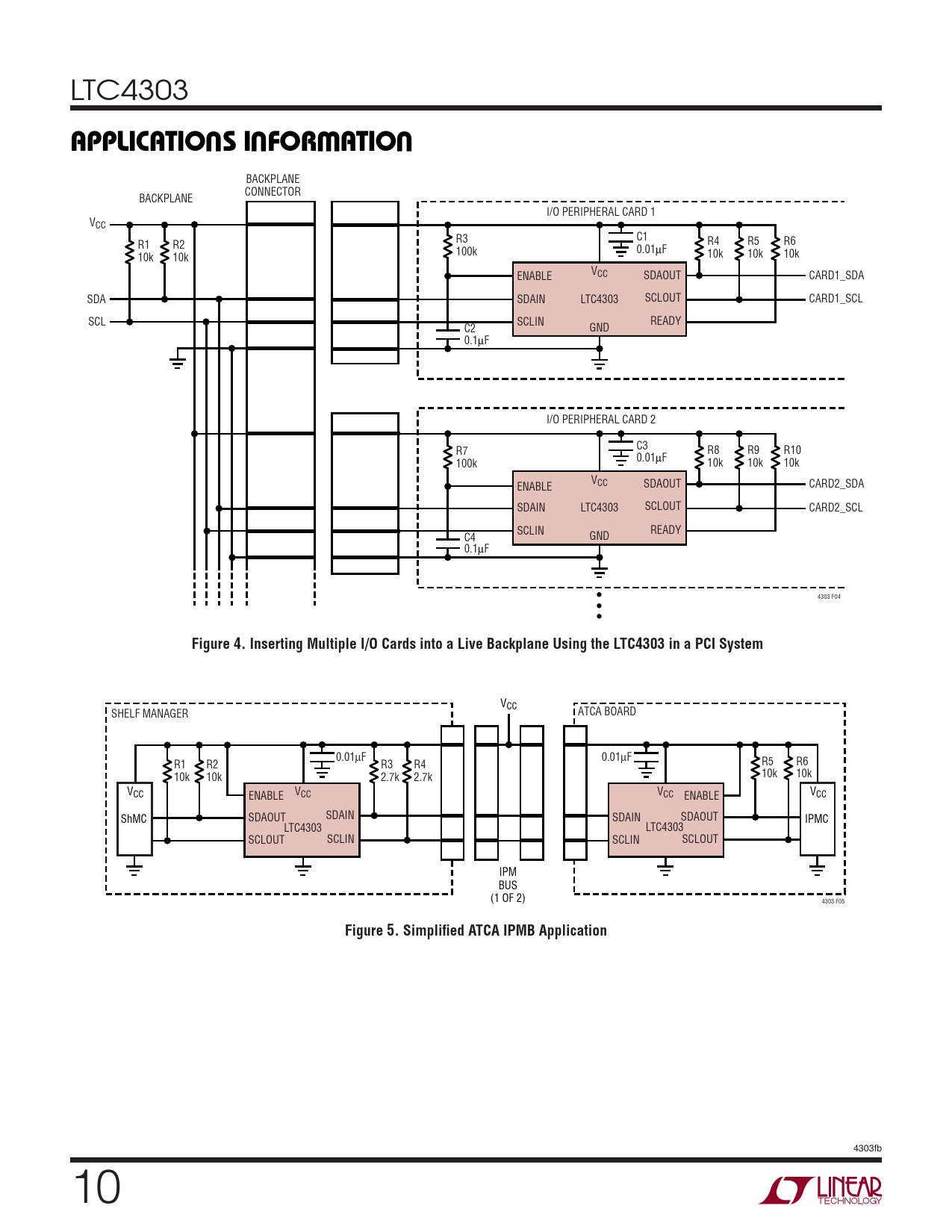 VCC SHELF MANAGER ATCA BOARD 0.01µF 0.01µF R1 R2 R3 R4 R5 R6 10k 10k 2.7k 2.7k 10k 10k VCC ENABLE VCC VCC ENABLE VCC SDAIN ShMC SDAOUT SDAIN SDAOUT IPMC LTC4303 LTC4303 SCLOUT SCLIN SCLIN SCLOUT IPM BUS (1 OF 2) 4303 F05