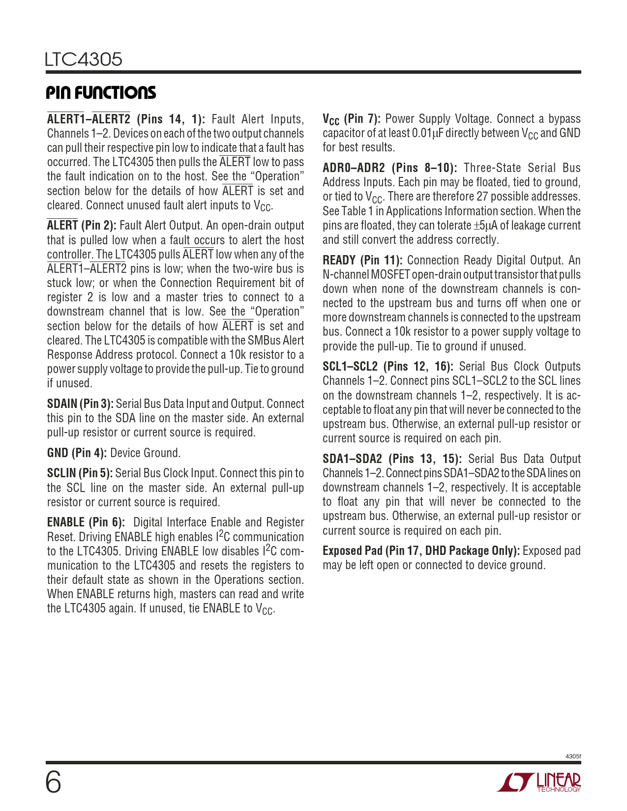 Exposed pad munication to the LTC4305 and resets the registers to may be left open or connected to device ground. their default state as shown in the Operations section. When ENABLE returns high, masters can read and write the LTC4305 again. If unused, tie ENABLE to VCC. 4305f 6