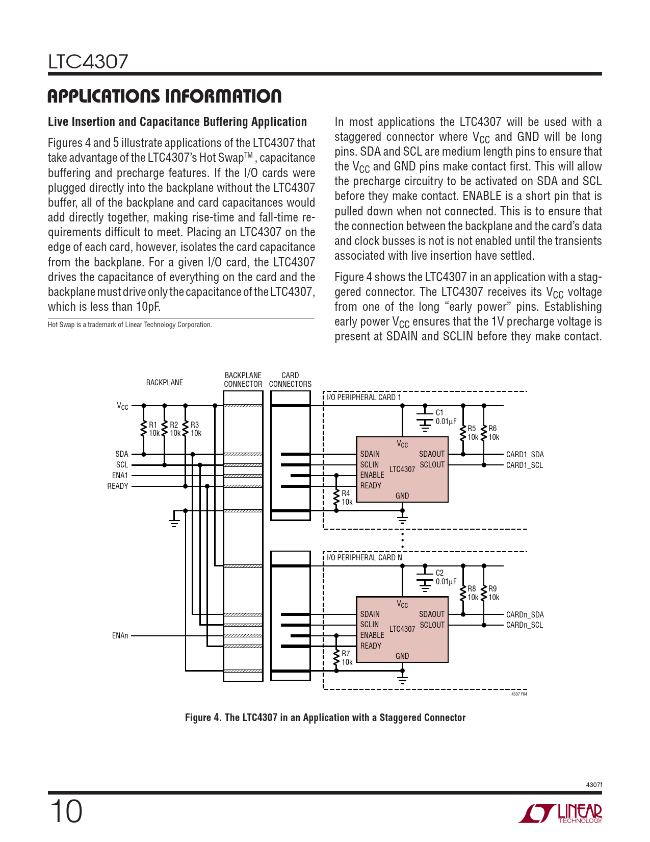 LTC4307 APPLICATIONS INFORMATIONLive Insertion and Capacitance Buffering Application In most applications the LTC4307 will be used with a staggered connector where V Figures 4 and 5 illustrate applications of the LTC4307 that CC and GND will be long pins. SDA and SCL are medium length pins to ensure that take advantage of the LTC4307’s Hot SwapTM , capacitance the V buffering and precharge features. If the I/O cards were CC and GND pins make contact fi rst. This will allow the precharge circuitry to be activated on SDA and SCL plugged directly into the backplane without the LTC4307 before they make contact. ENABLE is a short pin that is buffer, all of the backplane and card capacitances would pulled down when not connected. This is to ensure that add directly together, making rise-time and fall-time re- the connection between the backplane and the card’s data quirements diffi cult to meet. Placing an LTC4307 on the and clock busses is not is not enabled until the transients edge of each card, however, isolates the card capacitance associated with live insertion have settled. from the backplane. For a given I/O card, the LTC4307 drives the capacitance of everything on the card and the Figure 4 shows the LTC4307 in an application with a stag- backplane must drive only the capacitance of the LTC4307, gered connector. The LTC4307 receives its VCC voltage which is less than 10pF. from one of the long “early power” pins. Establishing Hot Swap is a trademark of Linear Technology Corporation. early power VCC ensures that the 1V precharge voltage is present at SDAIN and SCLIN before they make contact. BACKPLANE CARD BACKPLANE CONNECTOR CONNECTORS I/O PERIPHERAL CARD 1 VCC C1 0.01μF R1 R2 R3 R5 R6 10k 10k 10k 10k 10k VCC SDA SDAIN SDAOUT CARD1_SDA SCL SCLIN SCLOUT CARD1_SCL LTC4307 ENA1 ENABLE READY READY R4 GND 10k • • • I/O PERIPHERAL CARD N C2 0.01μF R8 R9 10k 10k VCC SDAIN SDAOUT CARDn_SDA SCLIN SCLOUT CARDn_SCL LTC4307 ENAn ENABLE READY R7 GND 10k 4307 F04 Figure 4. The LTC4307 in an Application with a Staggered Connector 4307f 10