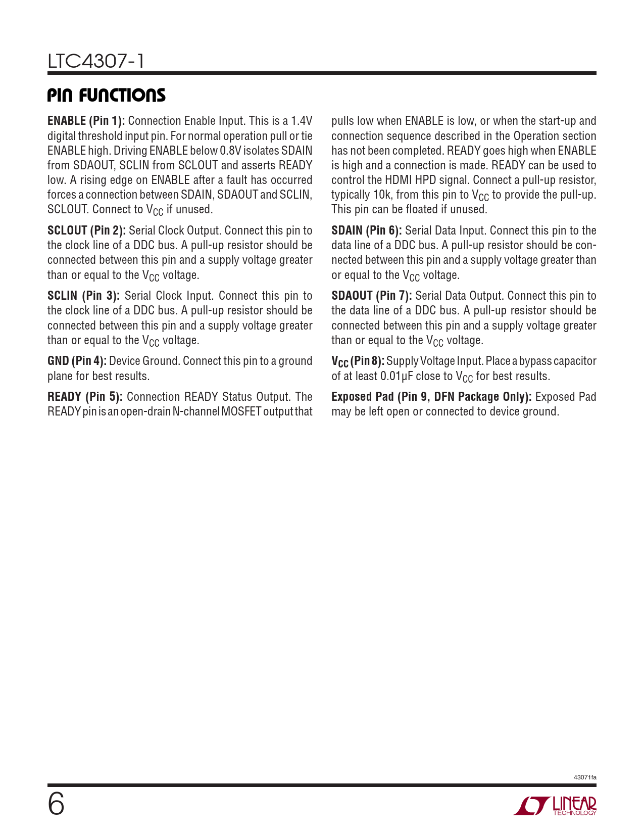 LTC4307-1 UUUPI FU CTIO SENABLE (Pin 1): Connection Enable Input. This is a 1.4V pulls low when ENABLE is low, or when the start-up and digital threshold input pin. For normal operation pull or tie connection sequence described in the Operation section ENABLE high. Driving ENABLE below 0.8V isolates SDAIN has not been completed. READY goes high when ENABLE from SDAOUT, SCLIN from SCLOUT and asserts READY is high and a connection is made. READY can be used to low. A rising edge on ENABLE after a fault has occurred control the HDMI HPD signal. Connect a pull-up resistor, forces a connection between SDAIN, SDAOUT and SCLIN, typically 10k, from this pin to VCC to provide the pull-up. SCLOUT. Connect to VCC if unused. This pin can be fl oated if unused. SCLOUT (Pin 2): Serial Clock Output. Connect this pin to SDAIN (Pin 6): Serial Data Input. Connect this pin to the the clock line of a DDC bus. A pull-up resistor should be data line of a DDC bus. A pull-up resistor should be con- connected between this pin and a supply voltage greater nected between this pin and a supply voltage greater than than or equal to the VCC voltage. or equal to the VCC voltage. SCLIN (Pin 3): Serial Clock Input. Connect this pin to SDAOUT (Pin 7): Serial Data Output. Connect this pin to the clock line of a DDC bus. A pull-up resistor should be the data line of a DDC bus. A pull-up resistor should be connected between this pin and a supply voltage greater connected between this pin and a supply voltage greater than or equal to the VCC voltage. than or equal to the VCC voltage. GND (Pin 4): Device Ground. Connect this pin to a ground VCC (Pin 8): Supply Voltage Input. Place a bypass capacitor plane for best results. of at least 0.01μF close to VCC for best results. READY (Pin 5): Connection READY Status Output. The Exposed Pad (Pin 9, DFN Package Only): Exposed Pad READY pin is an open-drain N-channel MOSFET output that may be left open or connected to device ground. 43071fa 6
